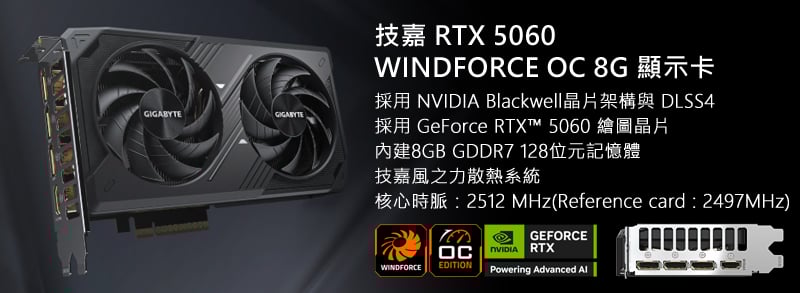 - 顯示卡:技嘉 RTX 5060 WINDFORCE OC 8G