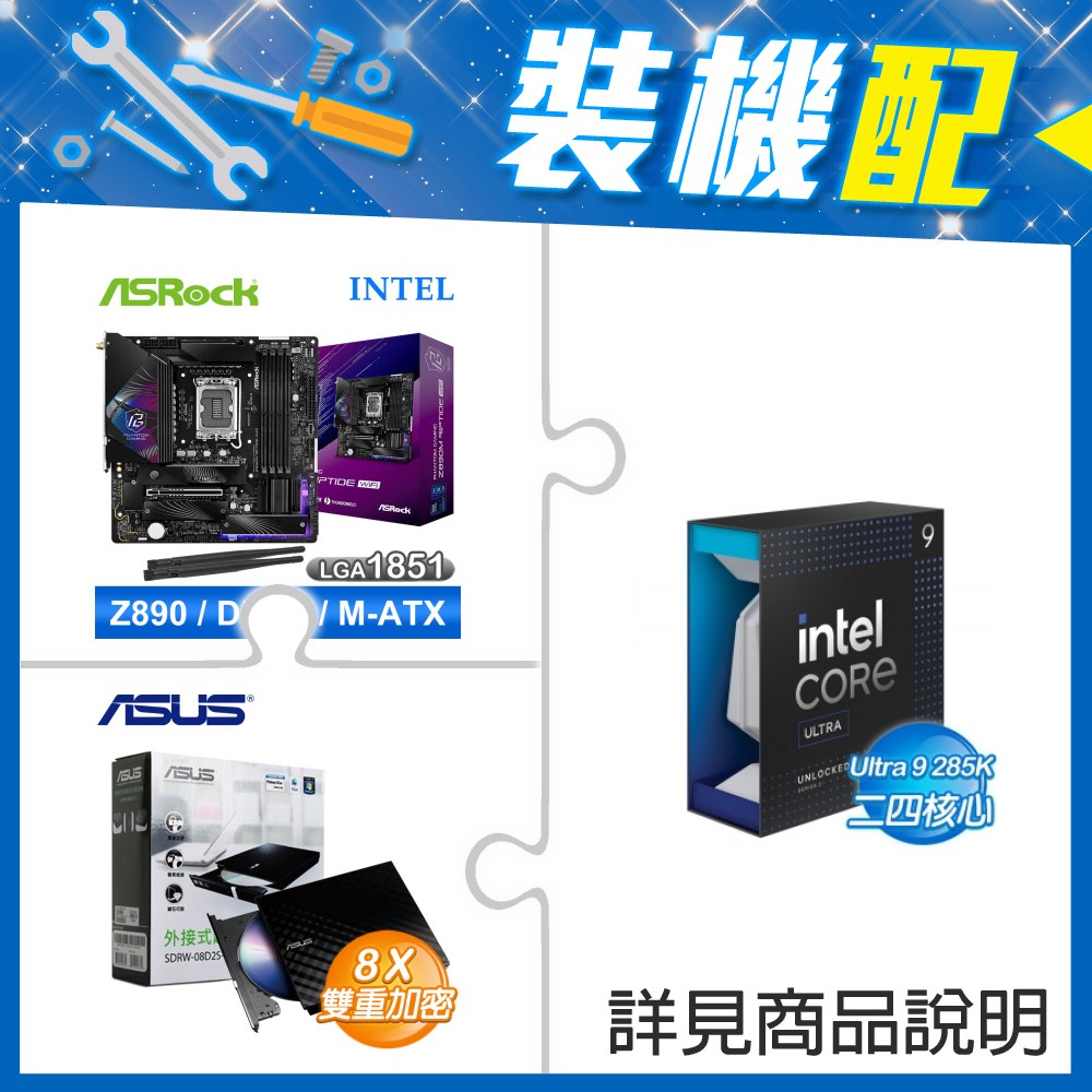 ☆裝機配★ Core U9 285K+華擎 Z890 Riptide WiFi D5 ATX主機板+華碩 SDRW-08D2S-U 外接式燒錄機《黑》