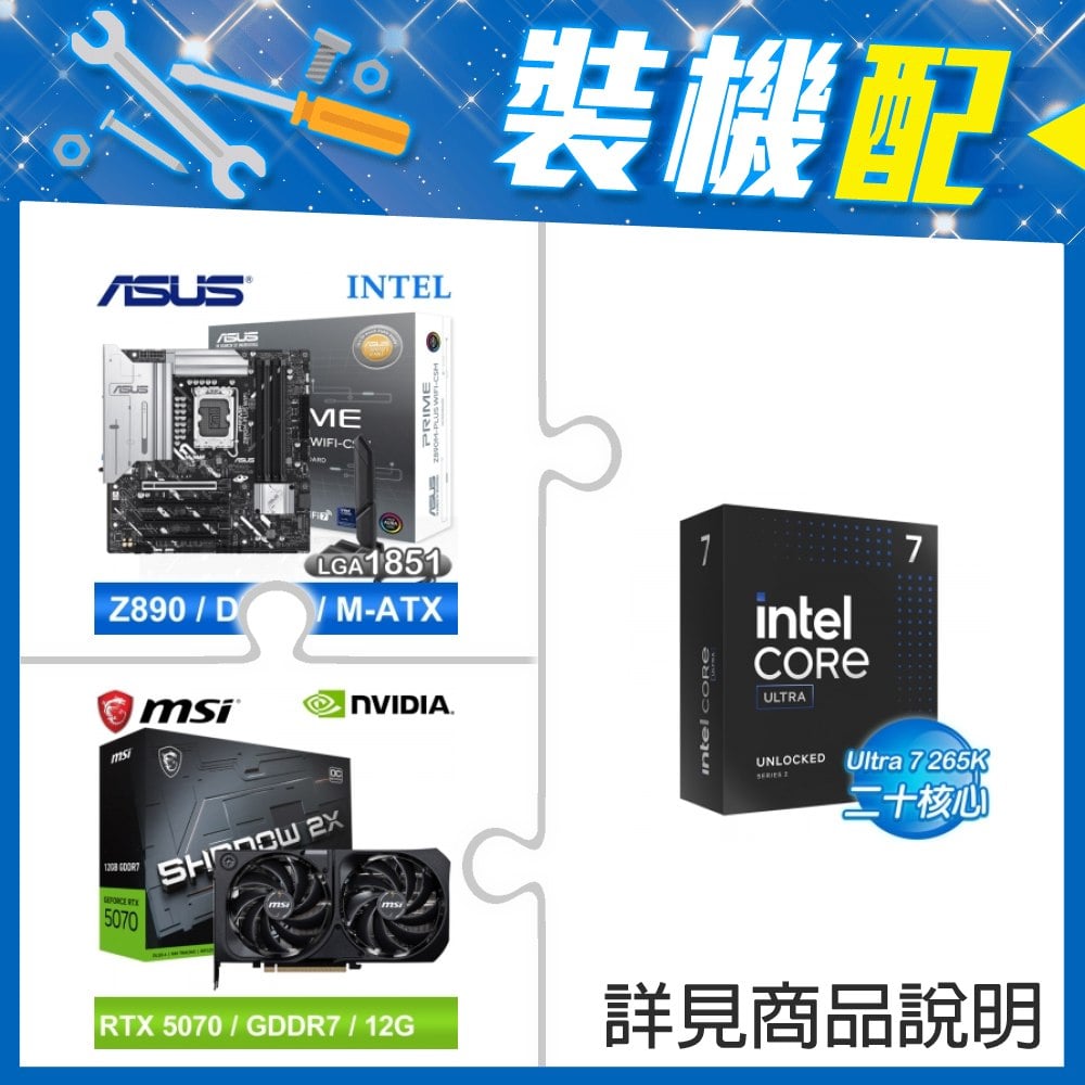 ☆裝機配★ Core U7 265K+華碩 PRIME Z890M-PLUS WIFI-CSM D5 M-ATX主機板+微星 RTX 5070 12G SHADOW 2X OC 顯示卡