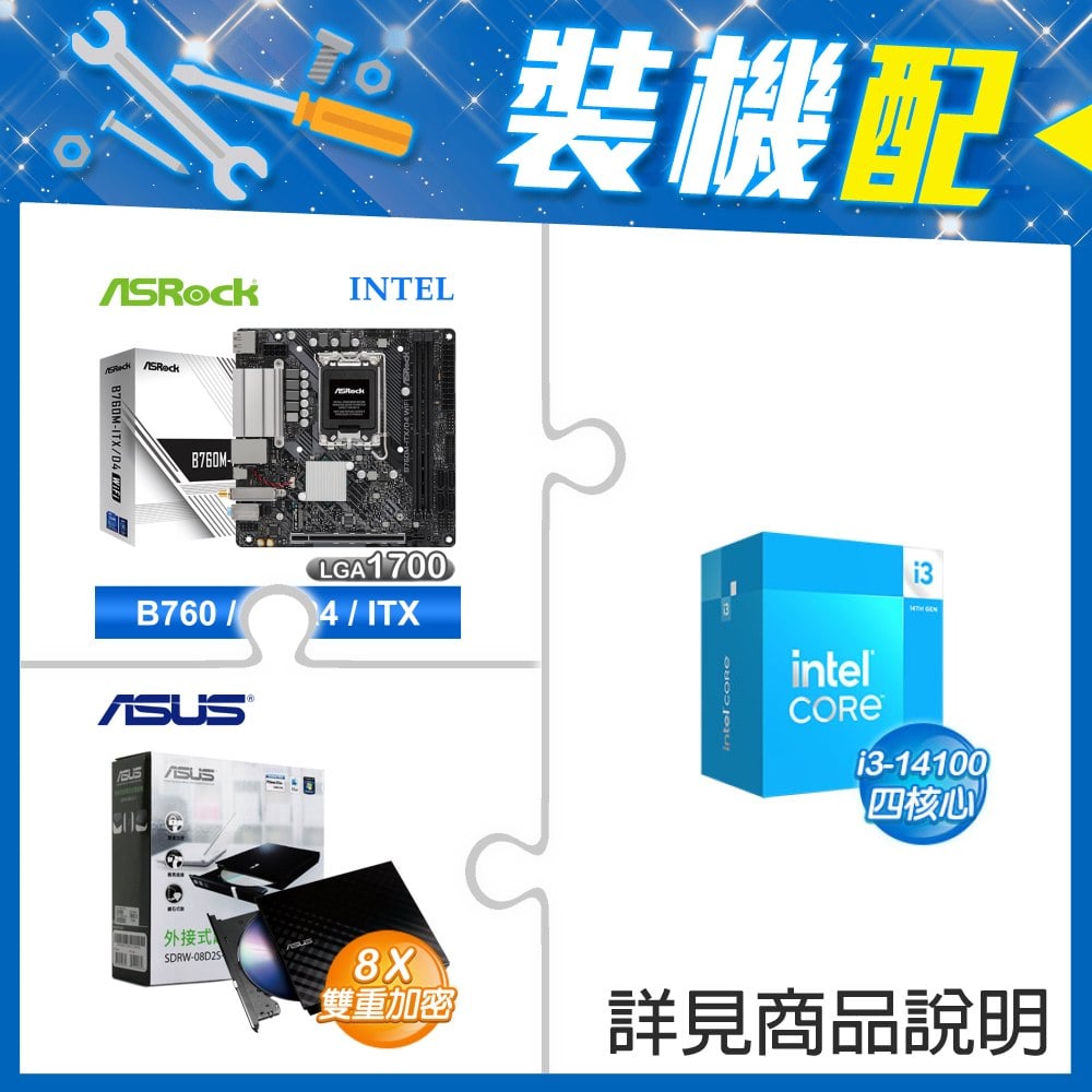 ☆裝機配★ i3-14100F+華擎 B760M-ITX/D4 WiFi ITX主機板+華碩 SDRW-08D2S-U 外接式燒錄機《黑》
