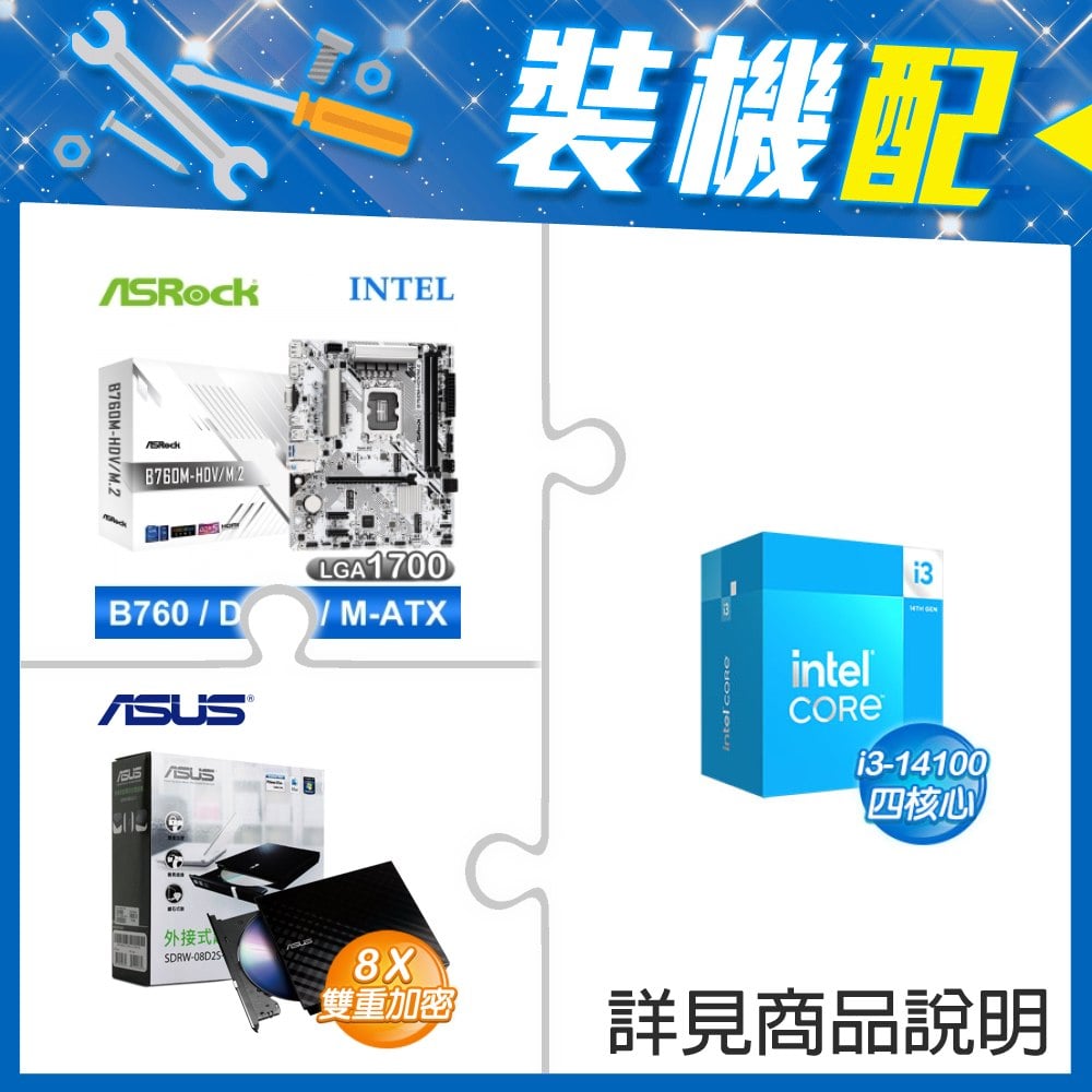 ☆裝機配★ i3-14100F+華擎 B760M-HDV D5 MATX主機板+華碩 SDRW-08D2S-U 外接式燒錄機《黑》
