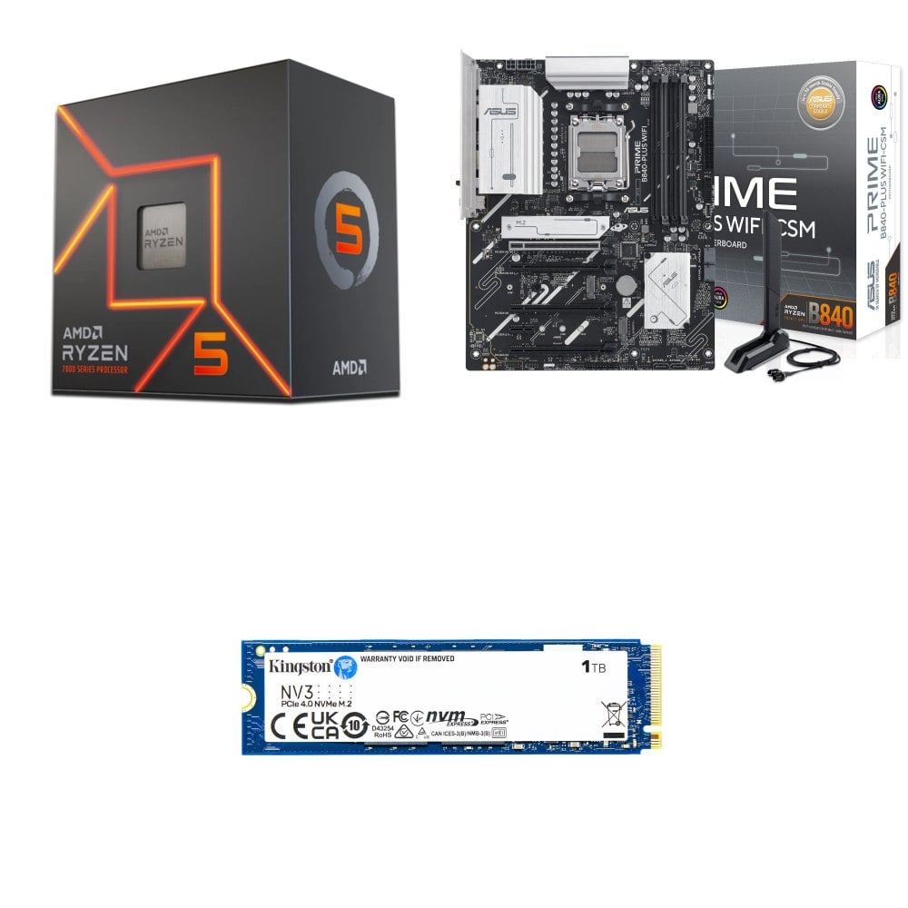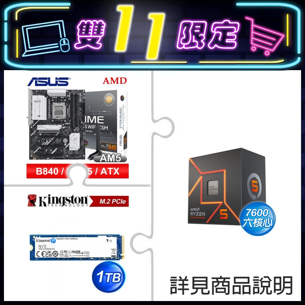 ☆期間限定★ AMD R5 7600+華碩 PRIME B840-PLUS WIFI-CSM ATX主機板+金士頓 NV3 1TB M.2 PCIe 4.0 SSD
