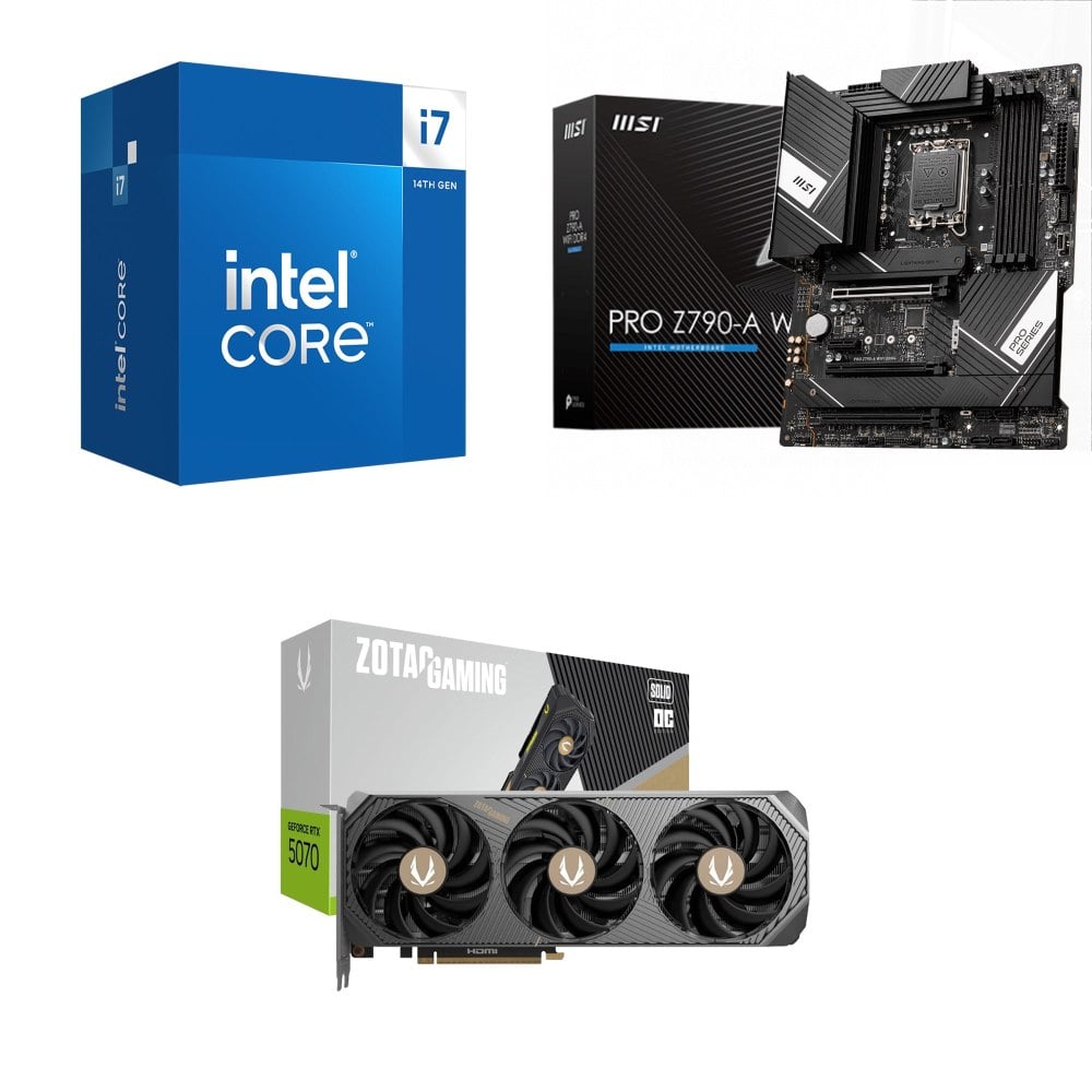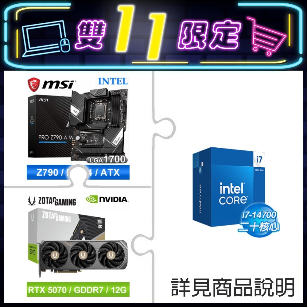 ☆期間限定★ i7-14700+微星 PRO Z790-A WIFI D4 ATX主機板+索泰 RTX 5070 SOLID OC 12G 顯示卡 ★送ZOTAC RGB 顯示卡支架
