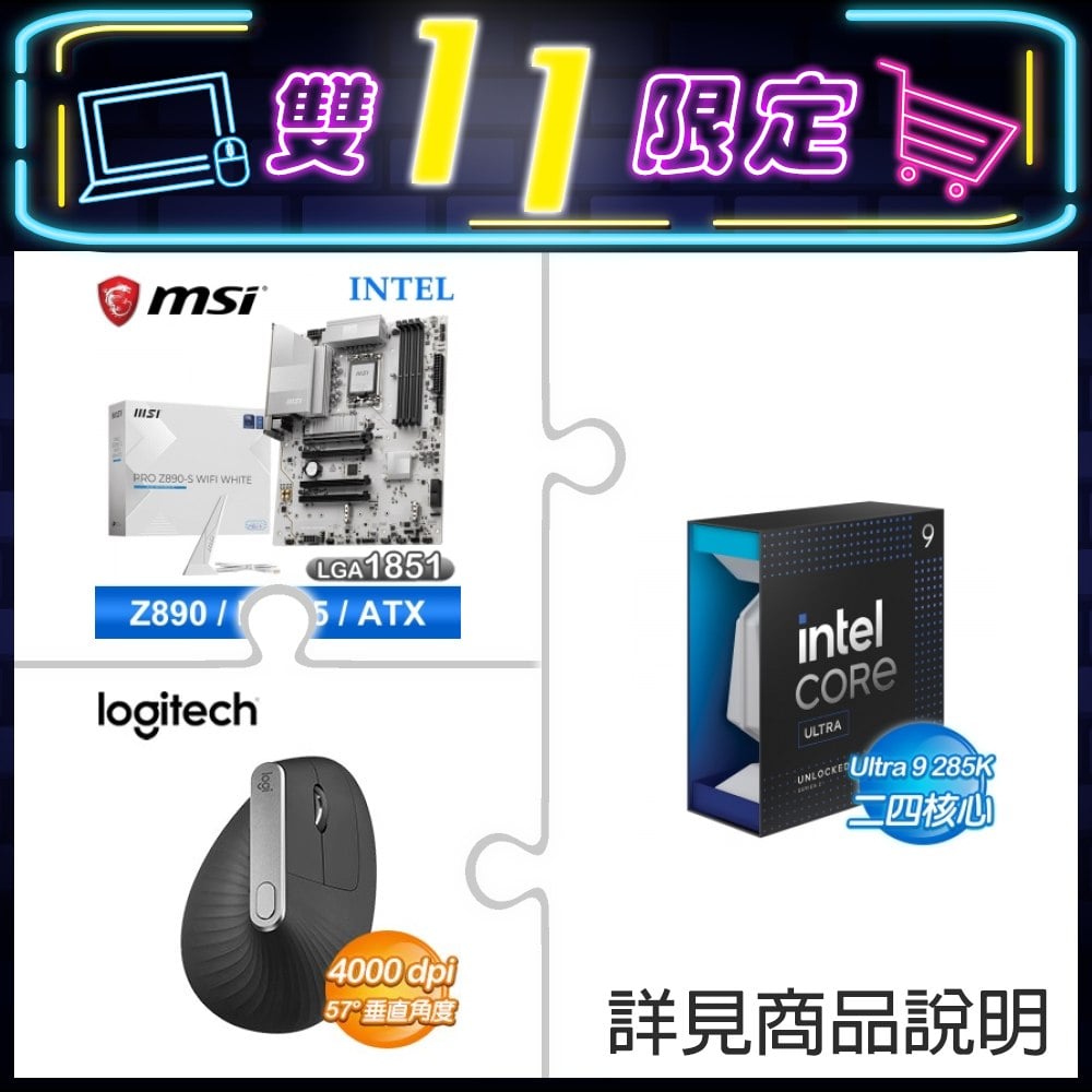 ☆期間限定★ Intel Core Ultra 9 285K+微星 PRO Z890-S WIFI WHITE D5 ATX主機板 ★送羅技 MX Vertical 人體工學垂直滑鼠