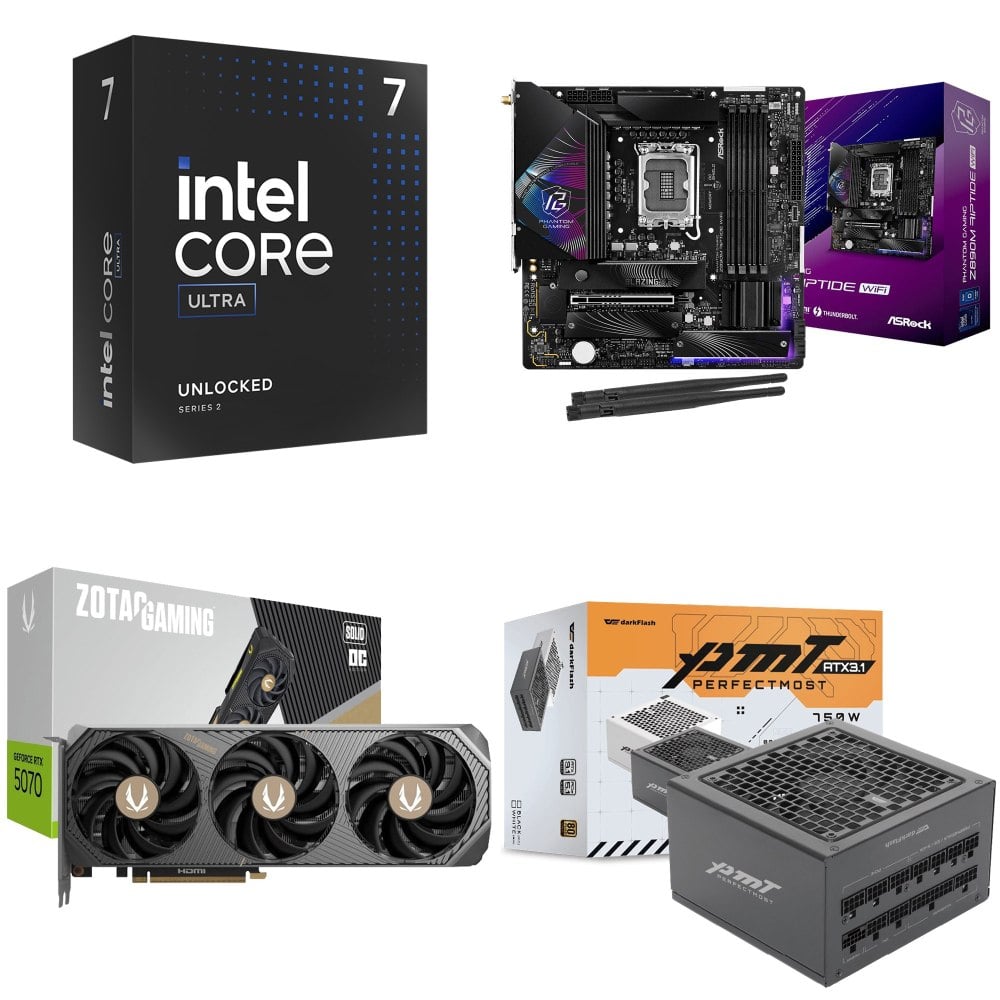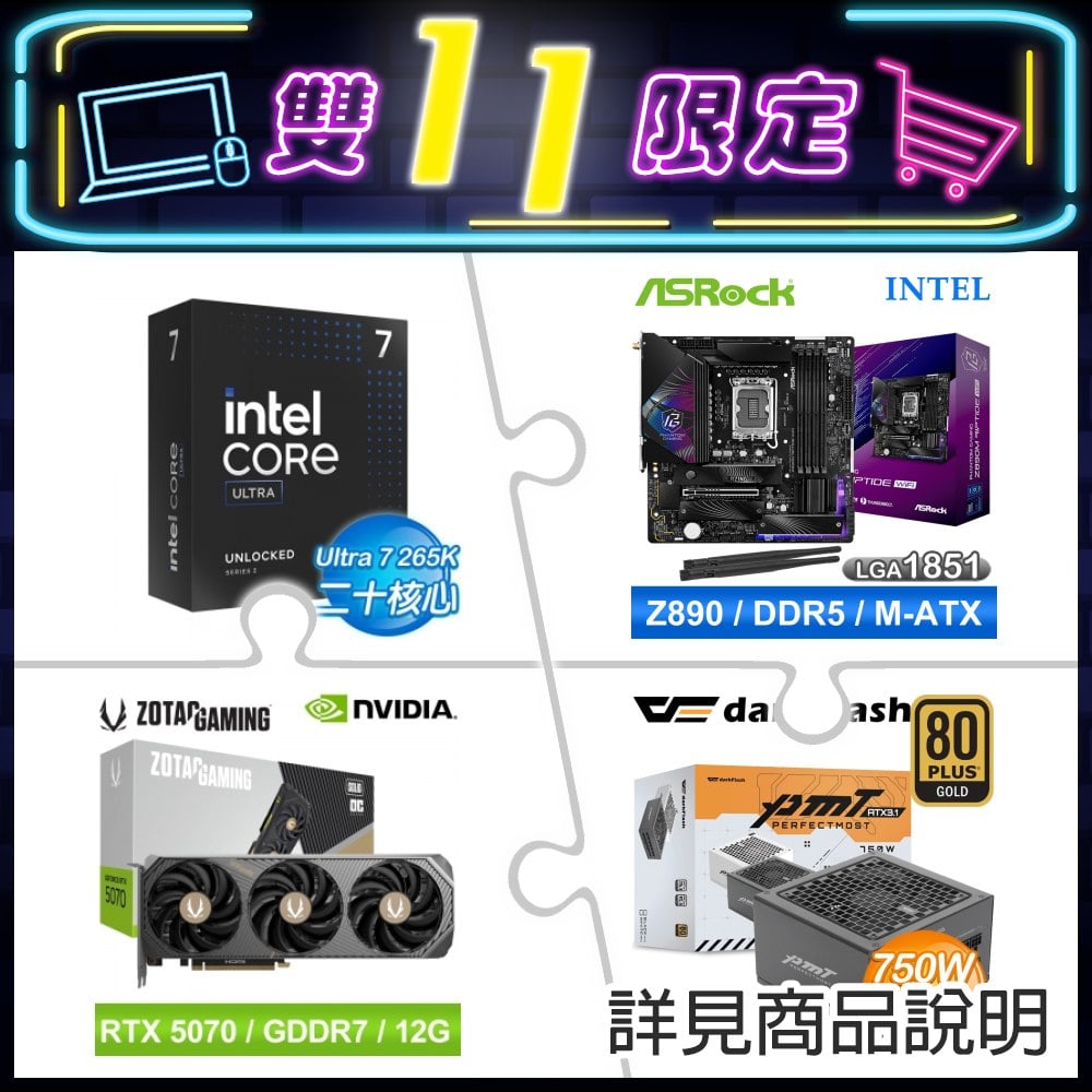 ☆期間限定★ Intel Core Ultra 7 265K+華擎 Z890M Riptide WiFi D5 M-ATX主機板+索泰 RTX 5070 SOLID OC 12G 顯示卡+darkFlash PMT 750W 金牌 全模組 ATX3.1 PCIe 5.1 電源供應器《黑》