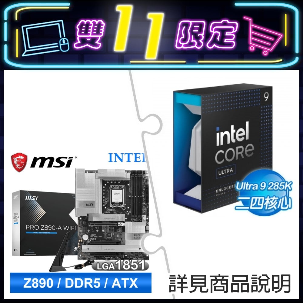 ☆期間限定★ Intel Core Ultra 9 285K+微星 PRO Z890-A WIFI D5 ATX主機板 ★送金士頓 DDR5-5600 32G CL46 記憶體