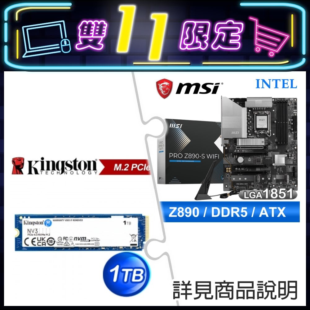 ☆期間限定★ 微星 PRO Z890-S WIFI D5 ATX主機板+金士頓 NV3 1TB M.2 PCIe 4.0 SSD ★送微星 FORGE GK320 RED TC 紅軸(可換)中文 RGB 機械鍵盤