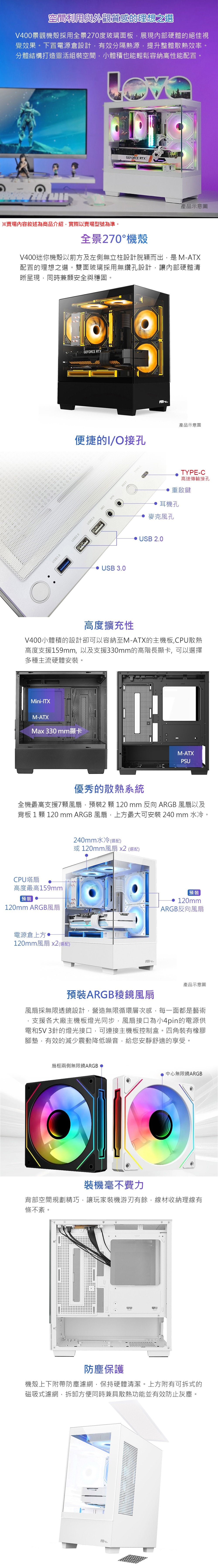 亞碩【景觀 Vista V400】全景玻璃透側 M-ATX機殼《白》(顯卡33/CPU高15.9)