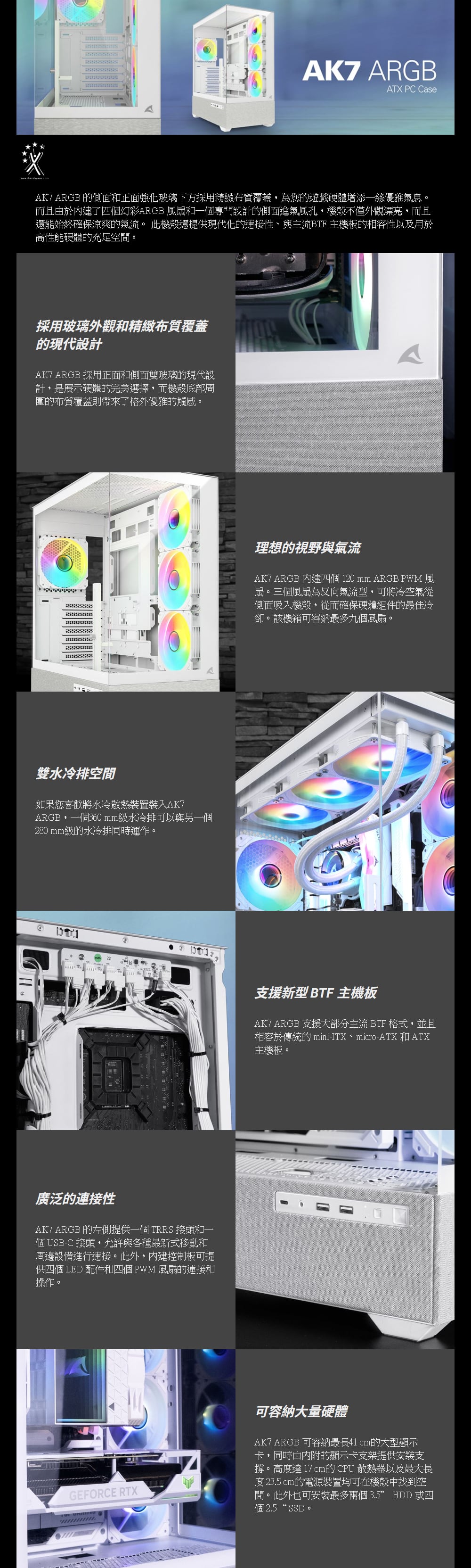Sharkoon 旋剛【AK7 ARGB(W)】全景玻璃透側 支援背插主機板 ATX機殼《白》(顯卡41/CPU高17)