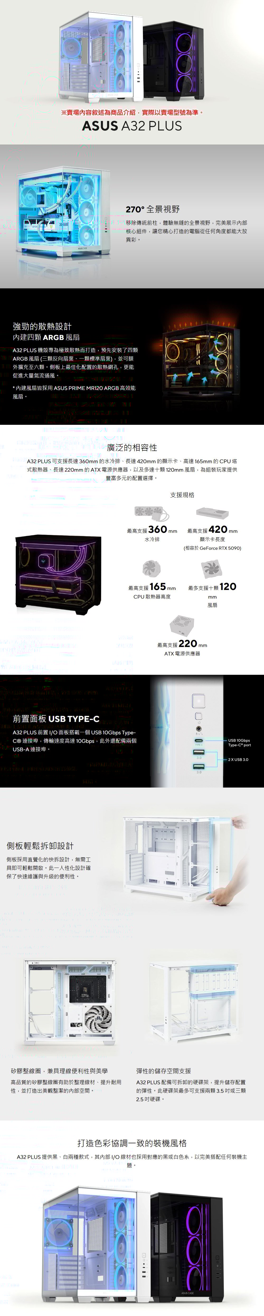 - 卓越的擴充相容性: A32 PLUS 可支援安裝長達 360mm 的水冷排、420mm 的顯示卡,以及高度 165mm 的 CPU 塔式散熱器