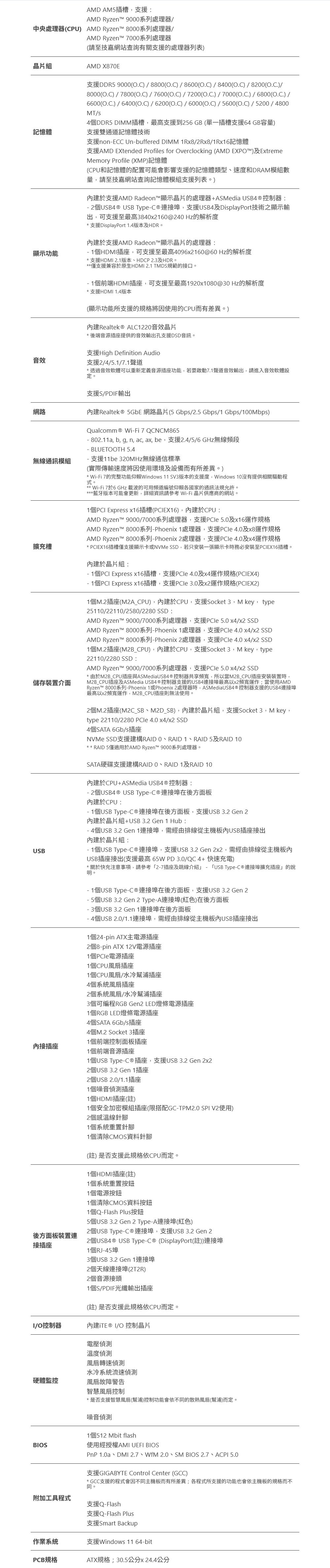 - AMD Socket AM5腳座設計 : 支援 AMD Ryzen™ 9000 / 8000 / 7000 系列處理器