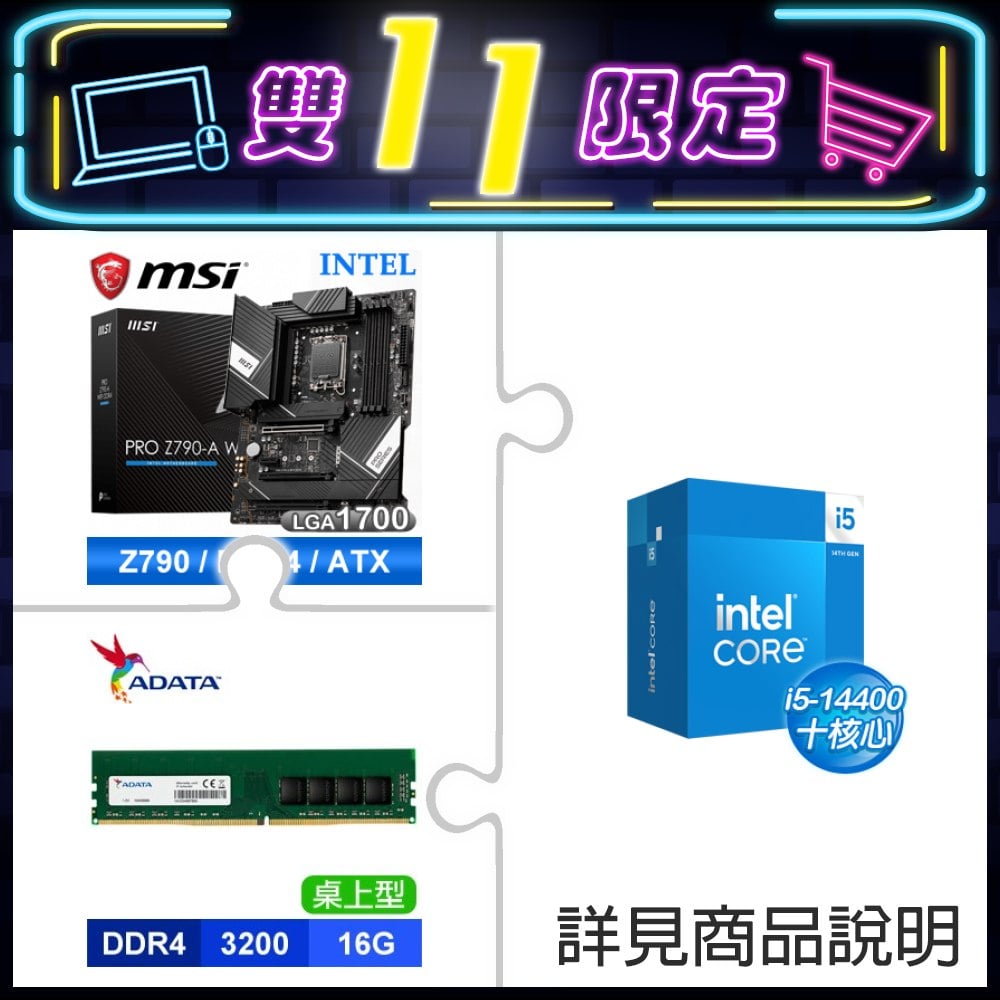 ☆期間限定★ i5-14400+微星 PRO Z790-A WIFI D4 ATX主機板+威剛 DDR4-3200 16G 記憶體(X2)