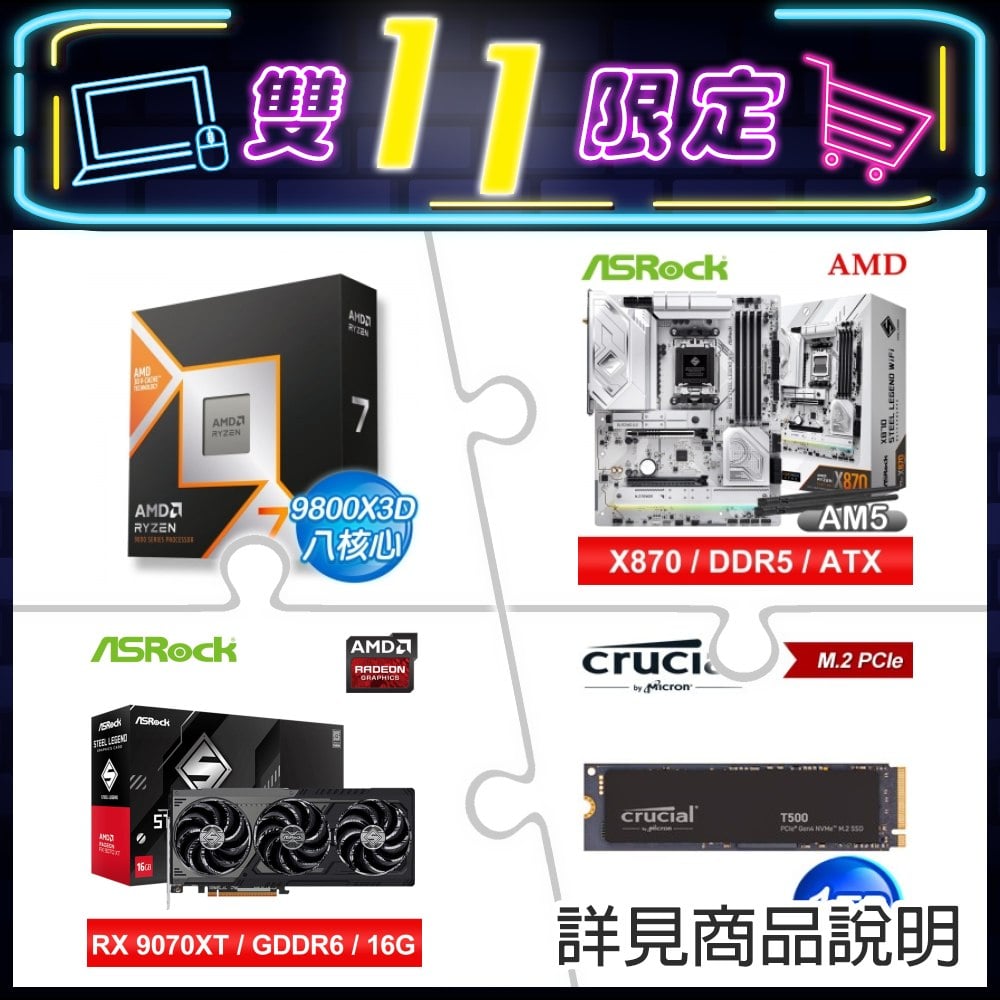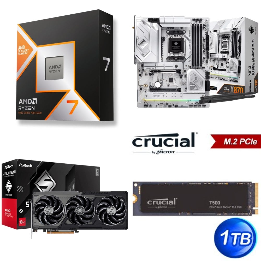 ☆期間限定★ AMD R7 9800X3D+華擎 X870 Steel Legend WiFi ATX主機板+華擎 RX 9070 XT Steel Legend 16GB(DARK)+美光 Crucial T500 1TB M.2 PCIe 4.0 SSD