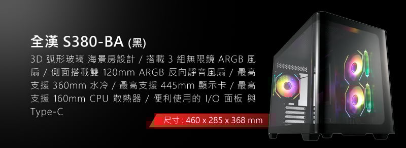 • 電腦機殼:全漢 S380-BA 全景玻璃透側 M-ATX 黑