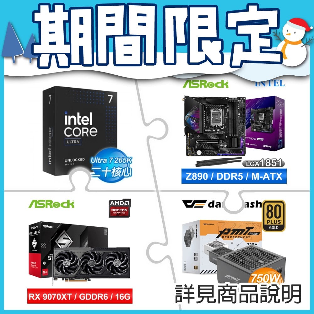 ☆期間限定★ Intel Core Ultra 7 265K+華擎 Z890M Riptide WiFi D5 M-ATX主機板+華擎 RX 9070 XT Steel Legend 16GB(DARK) 顯示卡+darkFlash PMT 750W 金牌 全模組 ATX3.1 PCIe 5.1 電源供應器《黑》