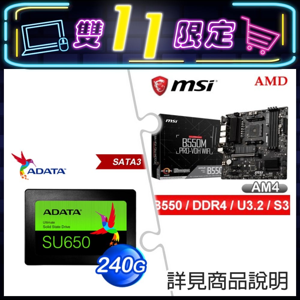 ☆期間限定★ 微星 B550M PRO-VDH WIFI M-ATX主機板+威剛 SU650 240G SSD