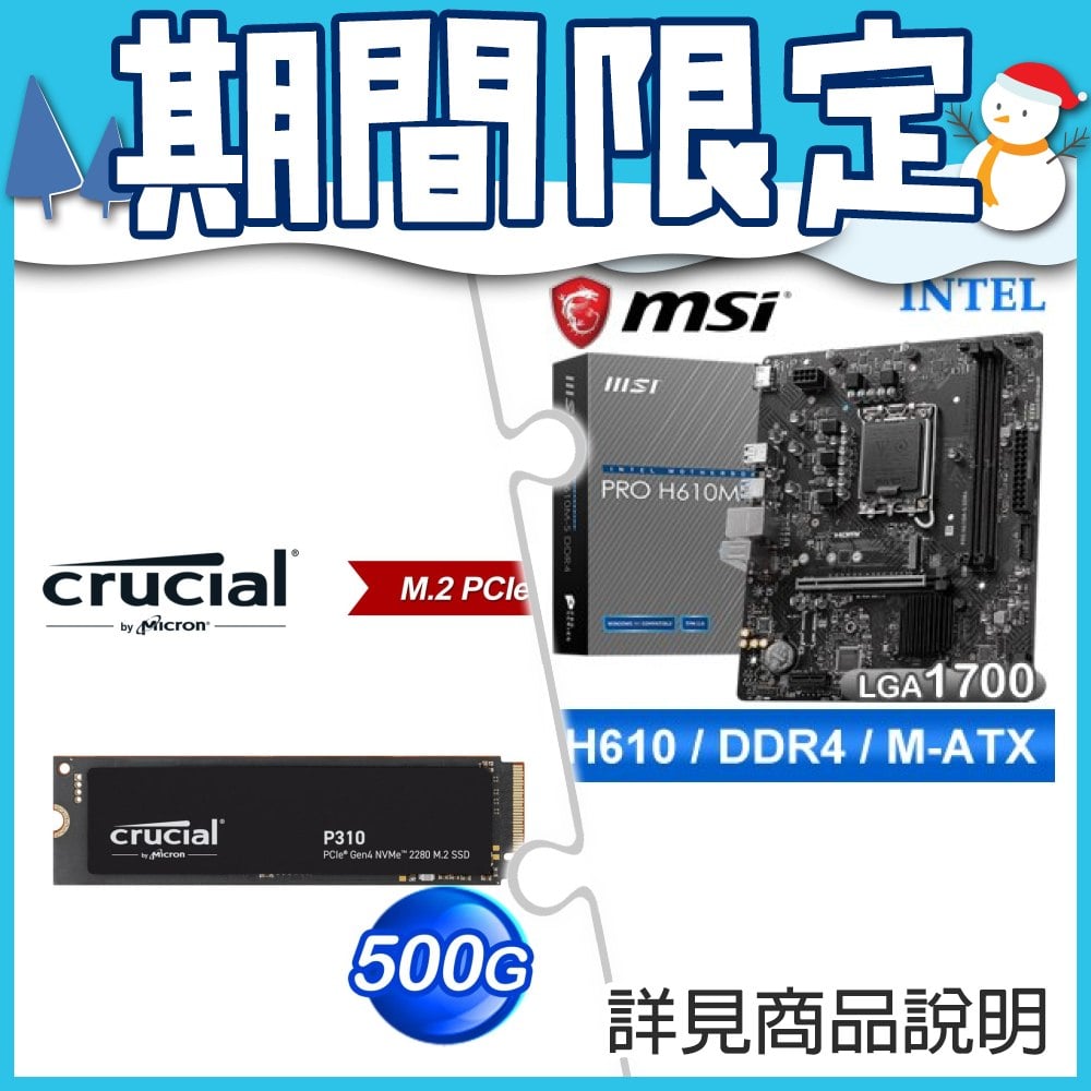 ☆期間限定★ 微星 PRO H610M-S D4 M-ATX主機板+美光 Crucial P310 500G BULK 五年保固 Gen4 2280 M.2 SSD (R/W:6600/3500MB/s)