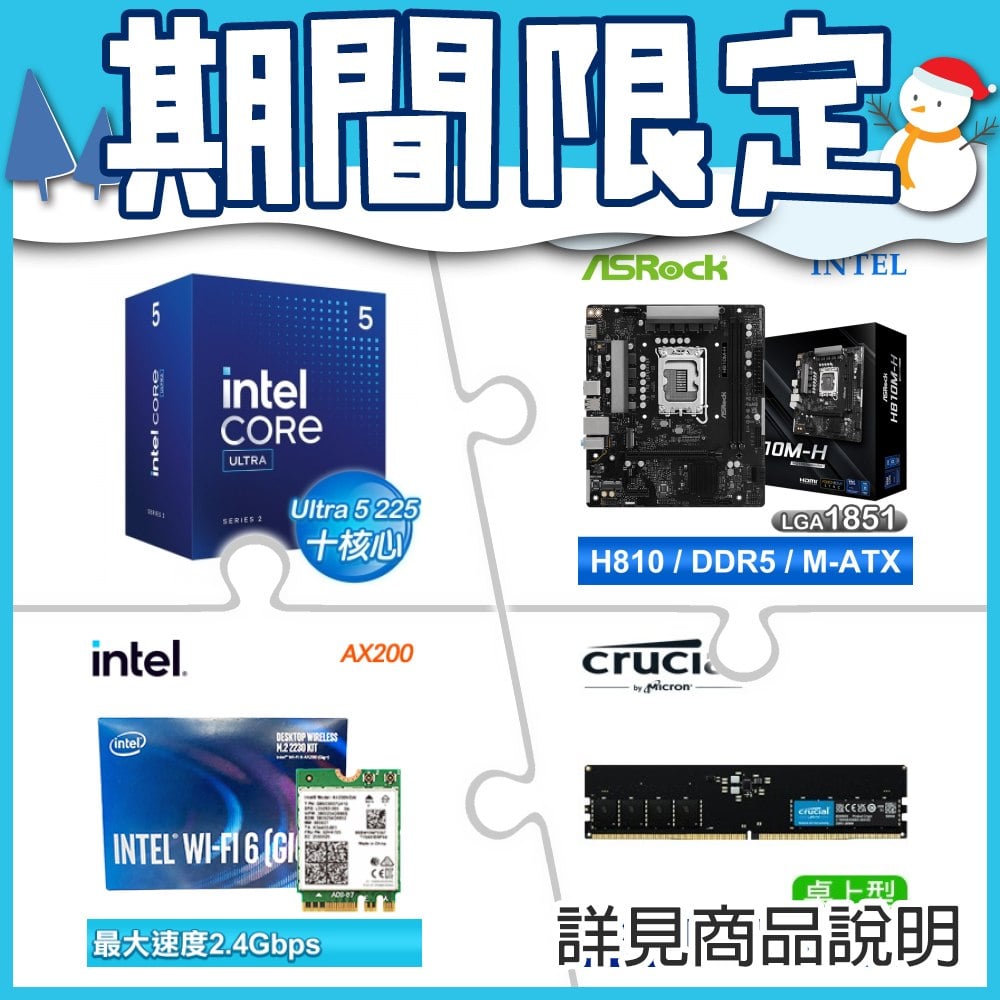 ☆期間限定★ Intel Core Ultra 5 225+華擎 H810M-H MATX 主機板+Intel AX200 Wi-Fi 6 (Gig+) M.2無線網卡+美光 Crucial DDR5-5600 16G 記憶體