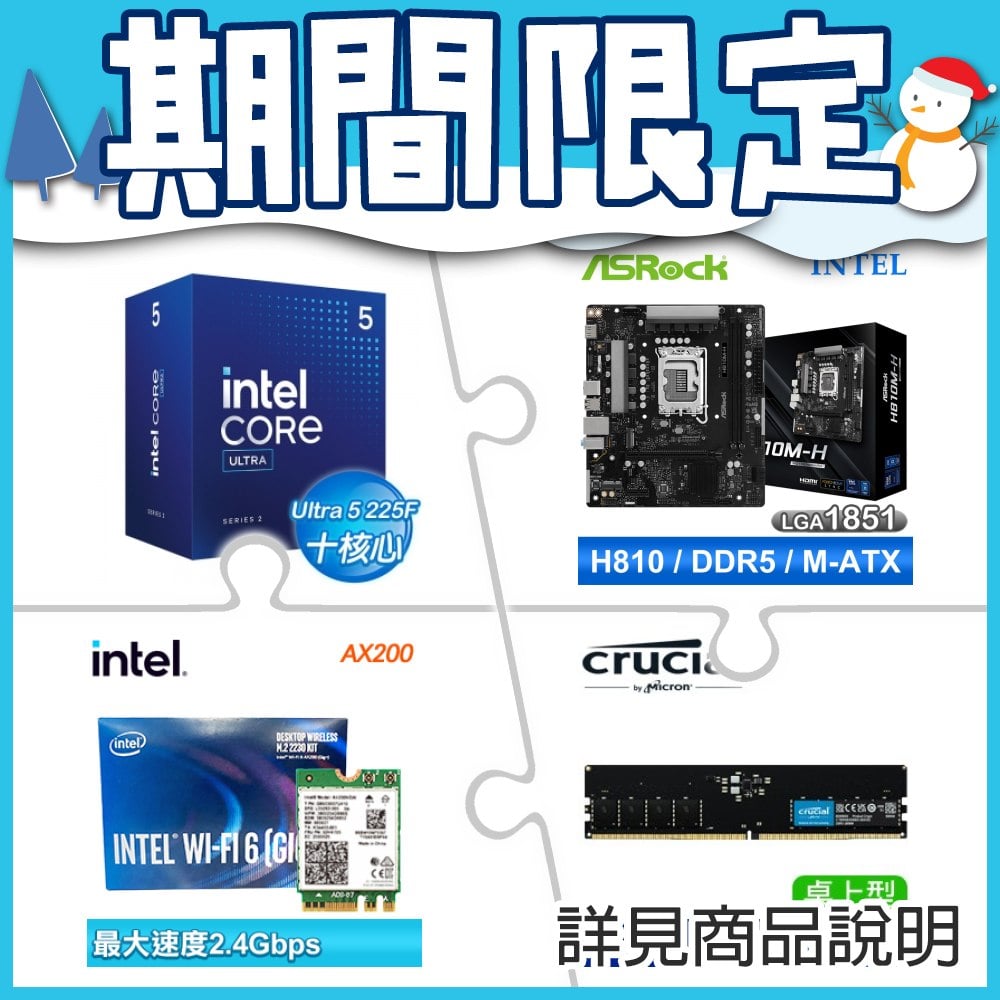 ☆期間限定★ Intel Core Ultra 5 225F+華擎 H810M-H MATX 主機板+Intel AX200 Wi-Fi 6 (Gig+) M.2無線網卡+美光 Crucial DDR5-5600 16G 記憶體