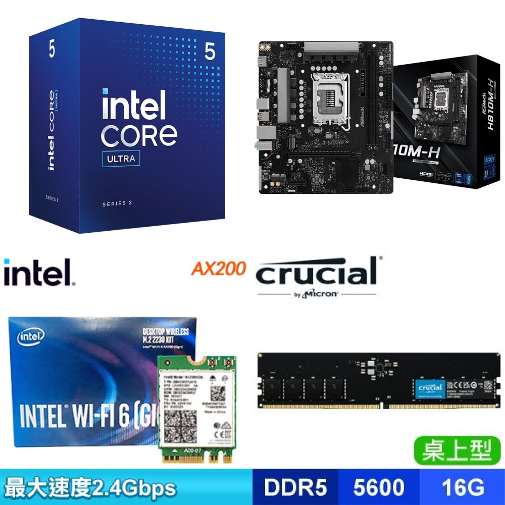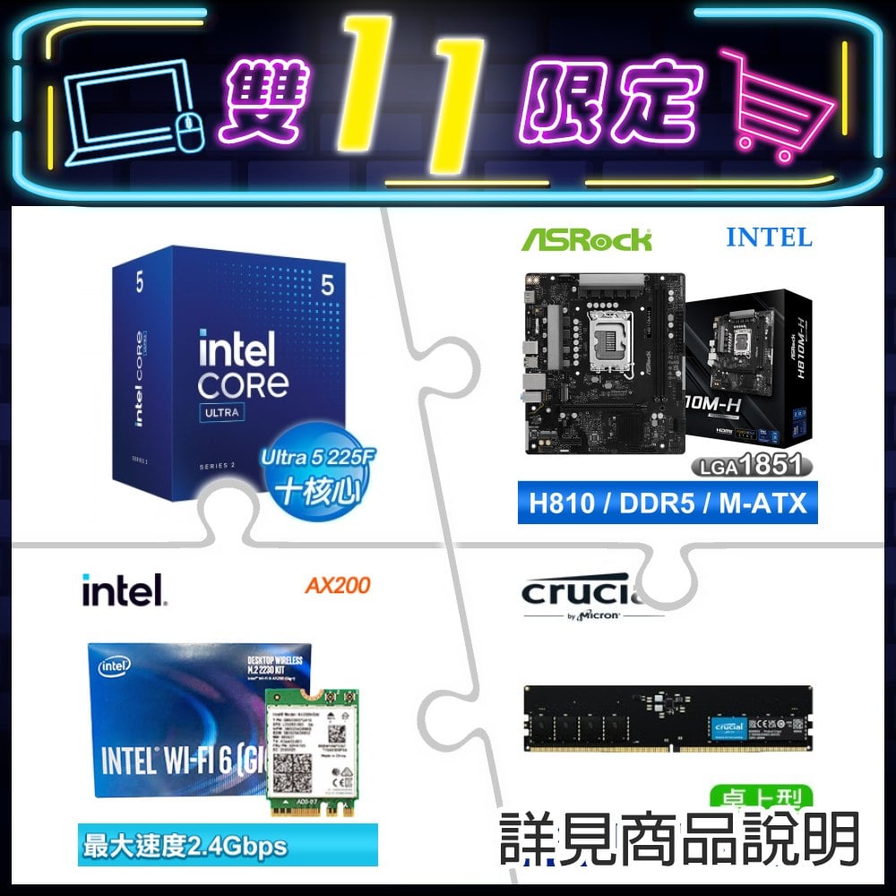 ☆期間限定★ Intel Core Ultra 5 225F+華擎 H810M-H MATX 主機板+Intel AX200 Wi-Fi 6 (Gig+) M.2無線網卡+美光 Crucial DDR5-5600 16G 記憶體