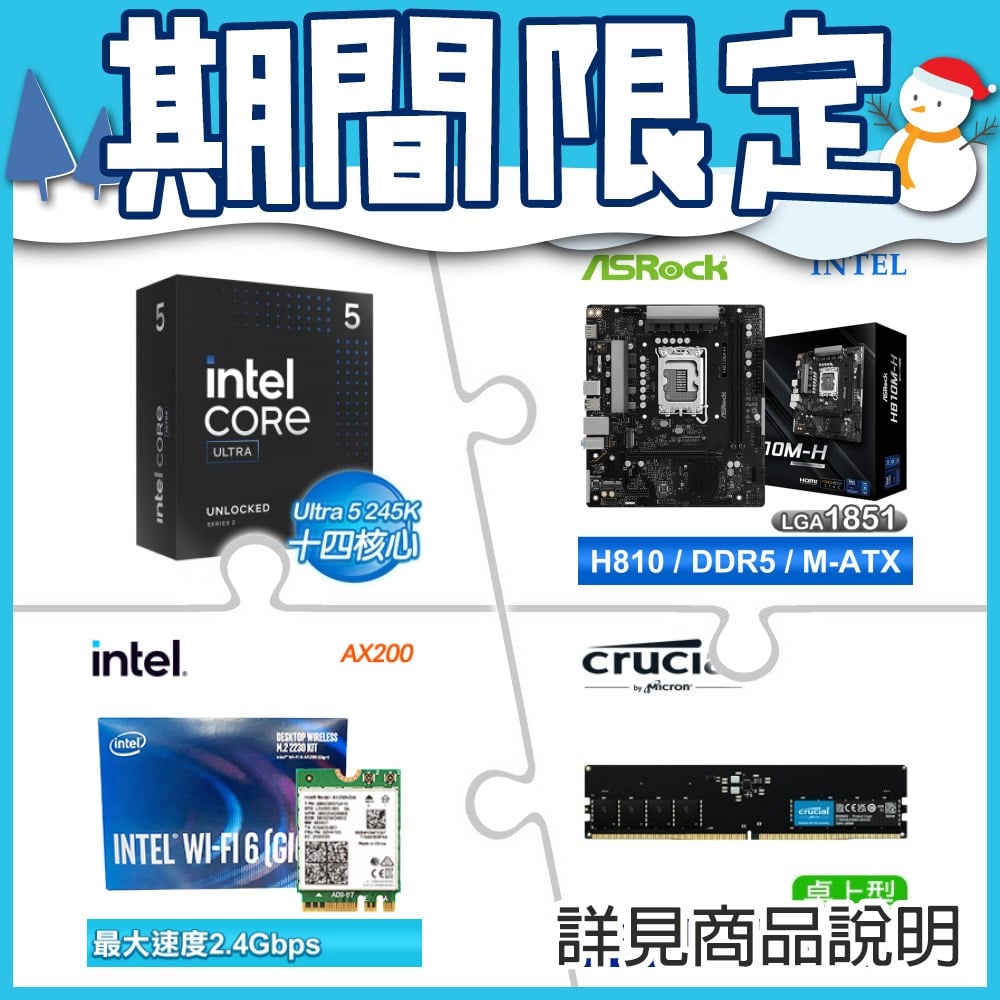 ☆期間限定★ Intel Core Ultra 5 245K+華擎 H810M-H MATX 主機板+Intel AX200 Wi-Fi 6 (Gig+) M.2無線網卡+美光 Crucial DDR5-5600 16G 記憶體