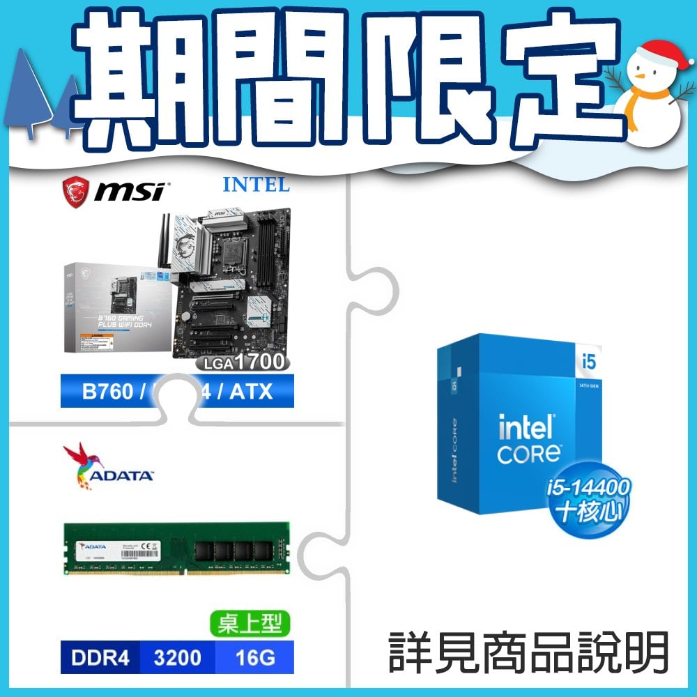 ☆期間限定★ i5-14400+微星 B760 GAMING PLUS WIFI D4 ATX主機板+威剛 DDR4-3200 16G 記憶體
