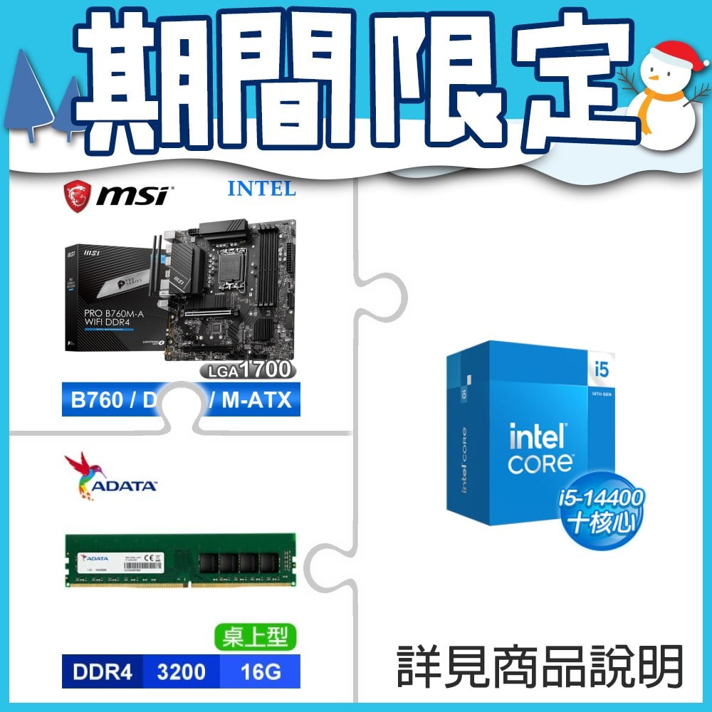 ☆期間限定★ i5-14400+微星 PRO B760M-A WIFI D4 M-ATX主機板+威剛 DDR4-3200 16G 記憶體