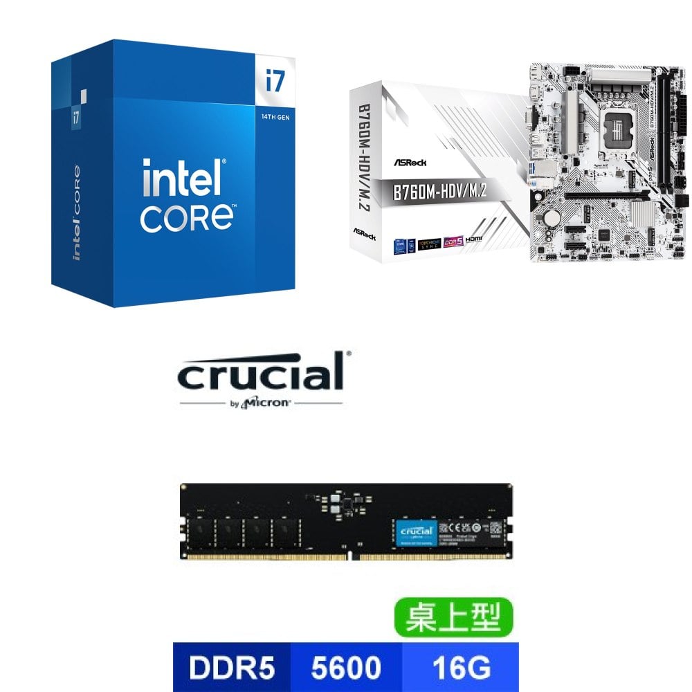☆期間限定★ i7-14700+華擎 B760M-HDV M.2 D5 M-ATX主機板+美光 Crucial DDR5-5600 16G 記憶體
