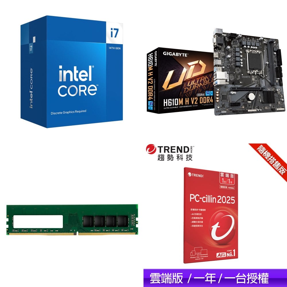 ☆期間限定★ i7-14700F+技嘉 H610M H V2 D4 M-ATX主機板+威剛 DDR4-3200 16G 記憶體 ★送PC-cillin 2025 雲端版 一年一台 隨機版