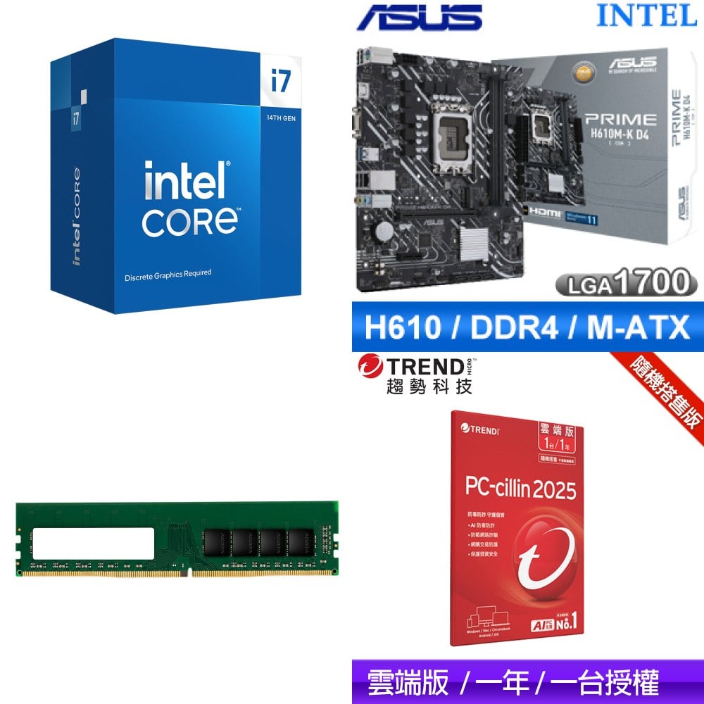 ☆期間限定★ i7-14700F+華碩 PRIME H610M-K D4-CSM M-ATX主機板+威剛 DDR4-3200 16G 記憶體 ★送PC-cillin 2025 雲端版 一年一台 隨機版