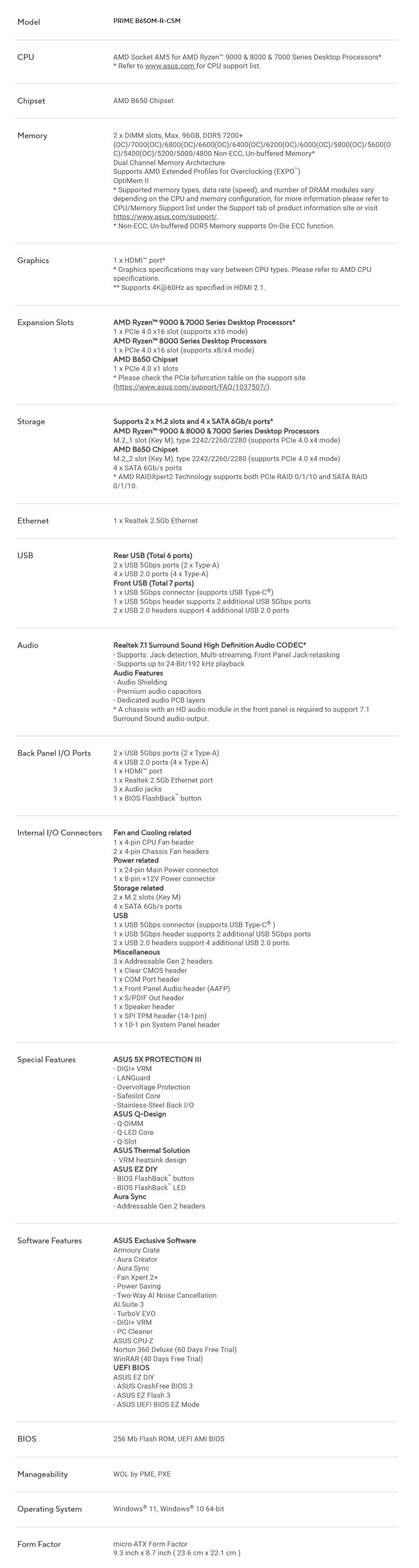 ASUS 華碩 PRIME B650M-R-CSM AM5主機板(MATX/3+1年保)