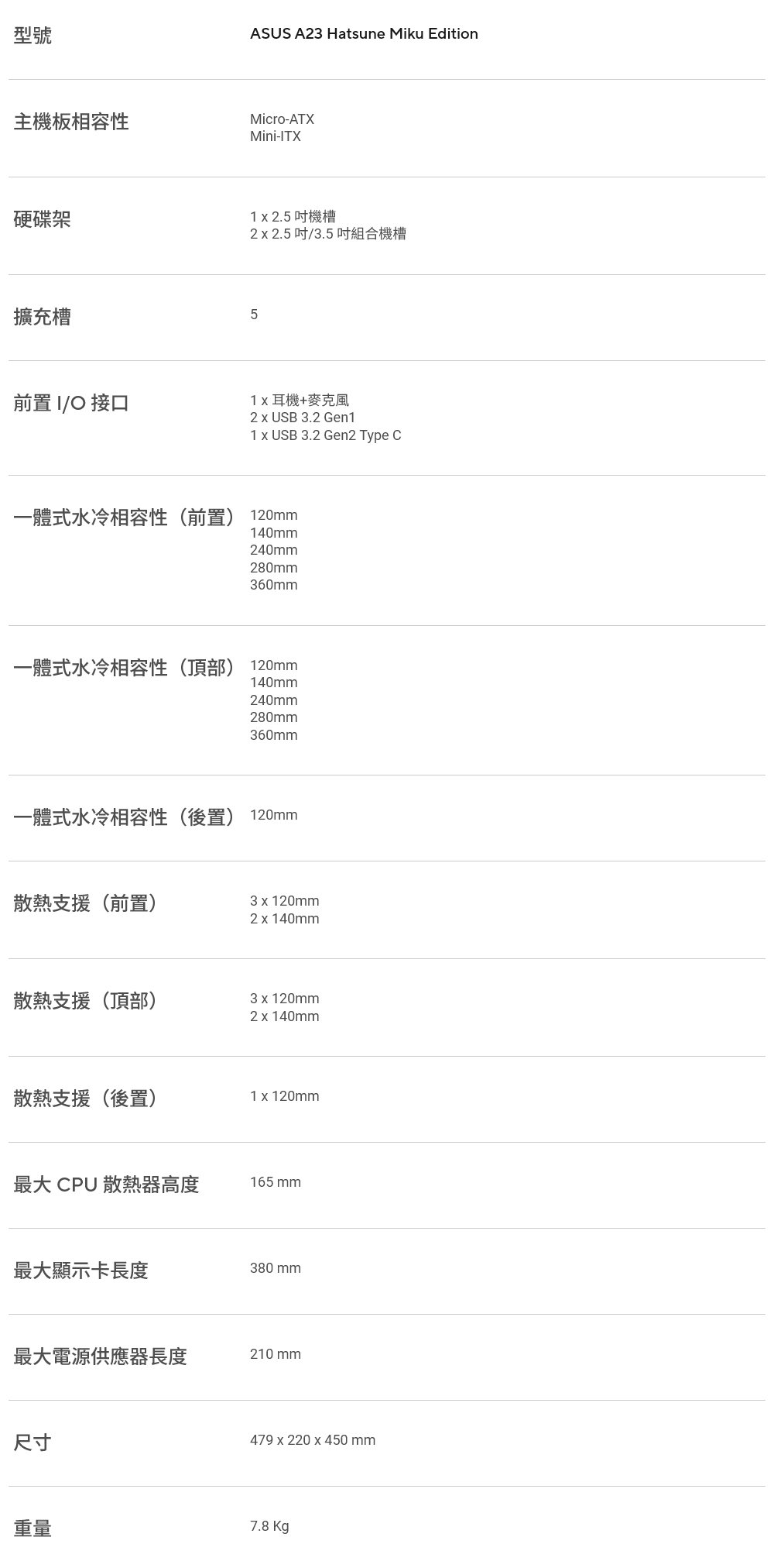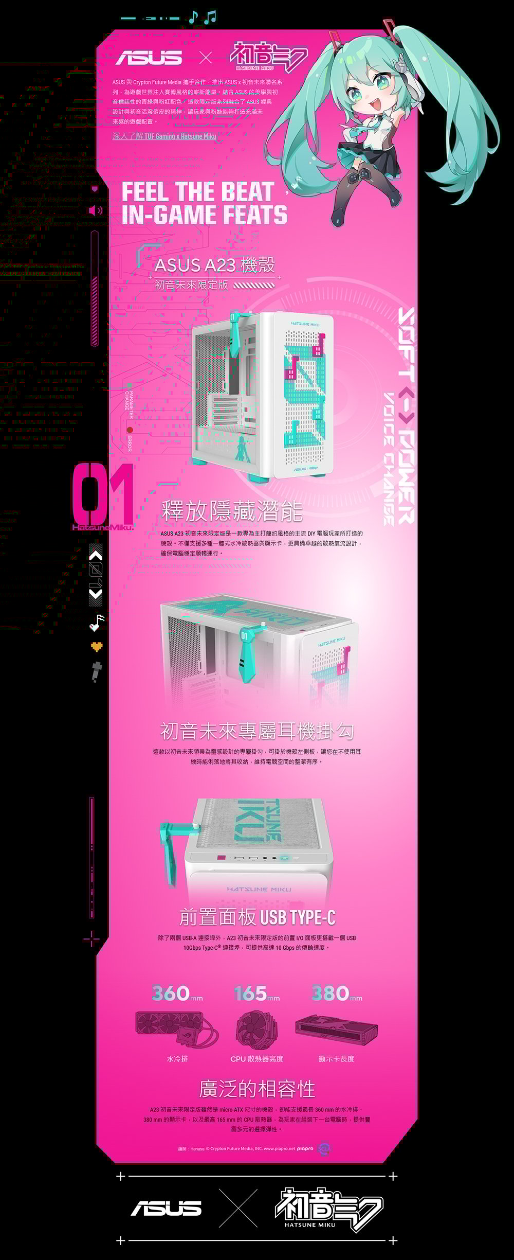 - 絕佳的擴充相容性: A23 初音未來特別版可支援長達 360 mm 的水冷排、380 mm 的高階顯示卡,以及高達 165 mm 的 CPU 散熱器