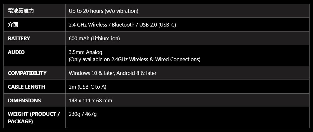 - 動態觸覺反饋:兩個震動馬達提供即時感官反饋,帶來沉浸且真實的體驗