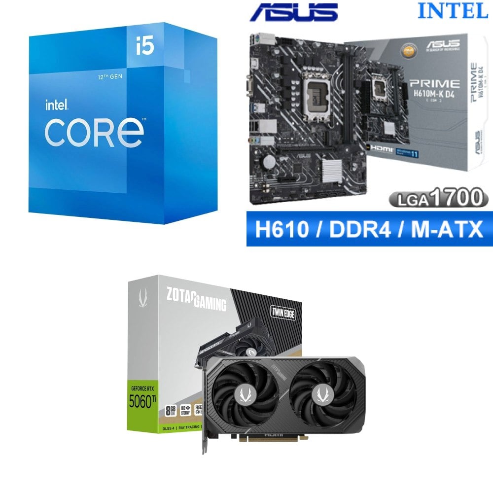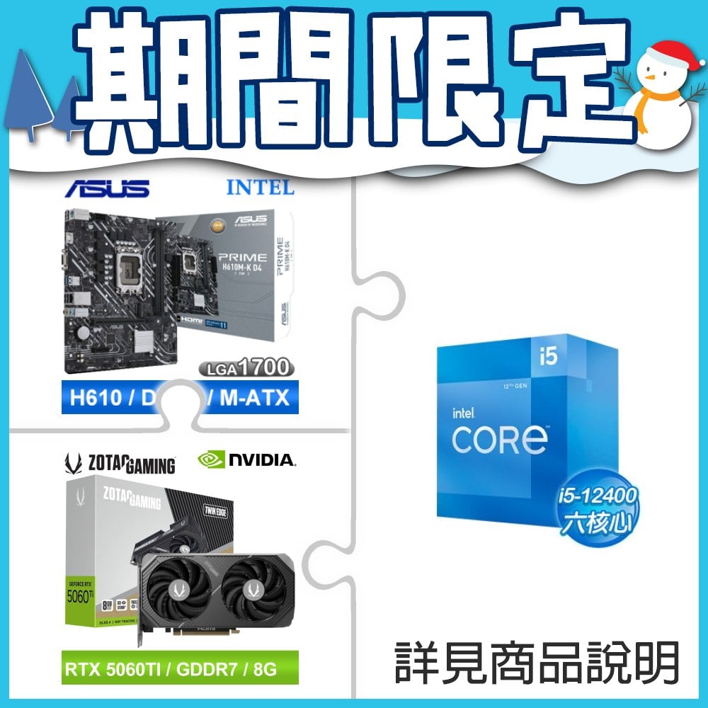 ☆期間限定★ i5-12400+華碩 PRIME H610M-K D4-CSM M-ATX主機板+索泰 RTX 5060 TI 8GB Twin Edge 顯示卡