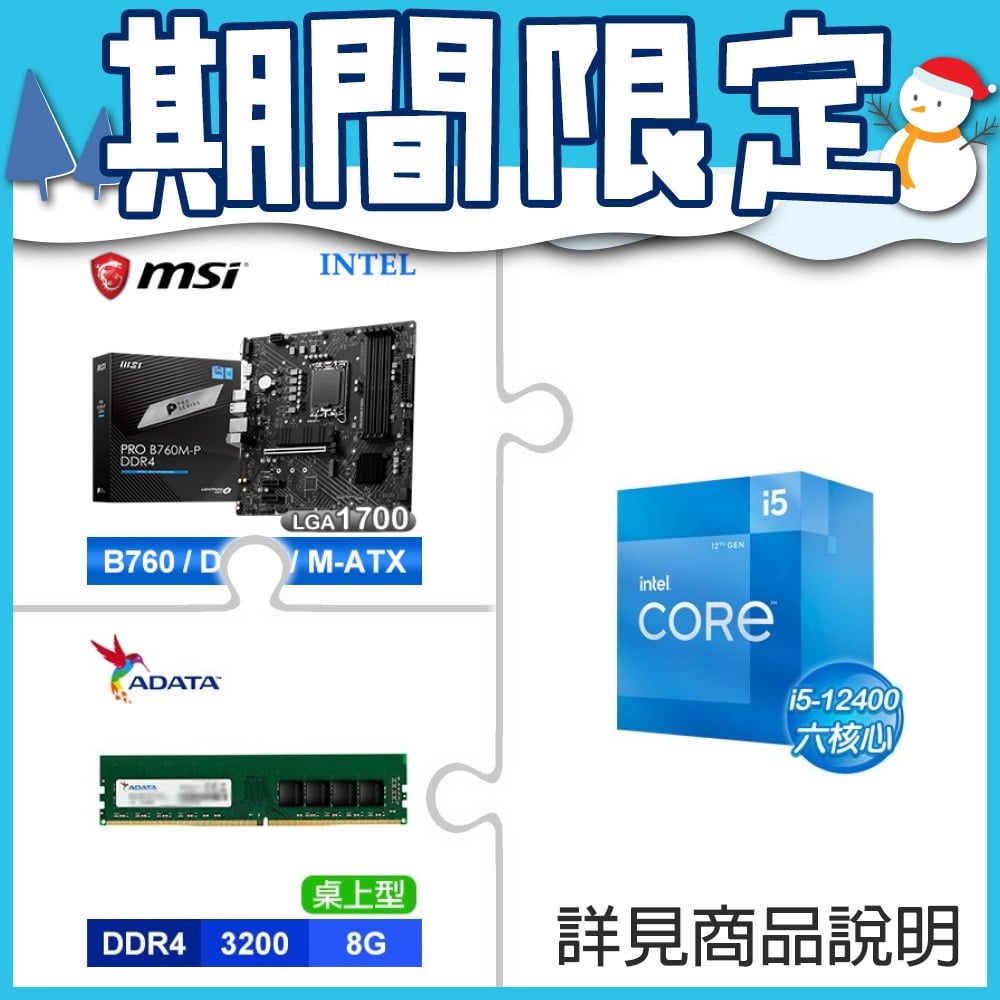 ☆期間限定★ i5-12400+微星 PRO B760M-P D4 MATX主機板+威剛 DDR4-3200 8G 記憶體
