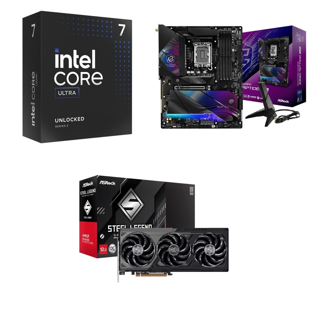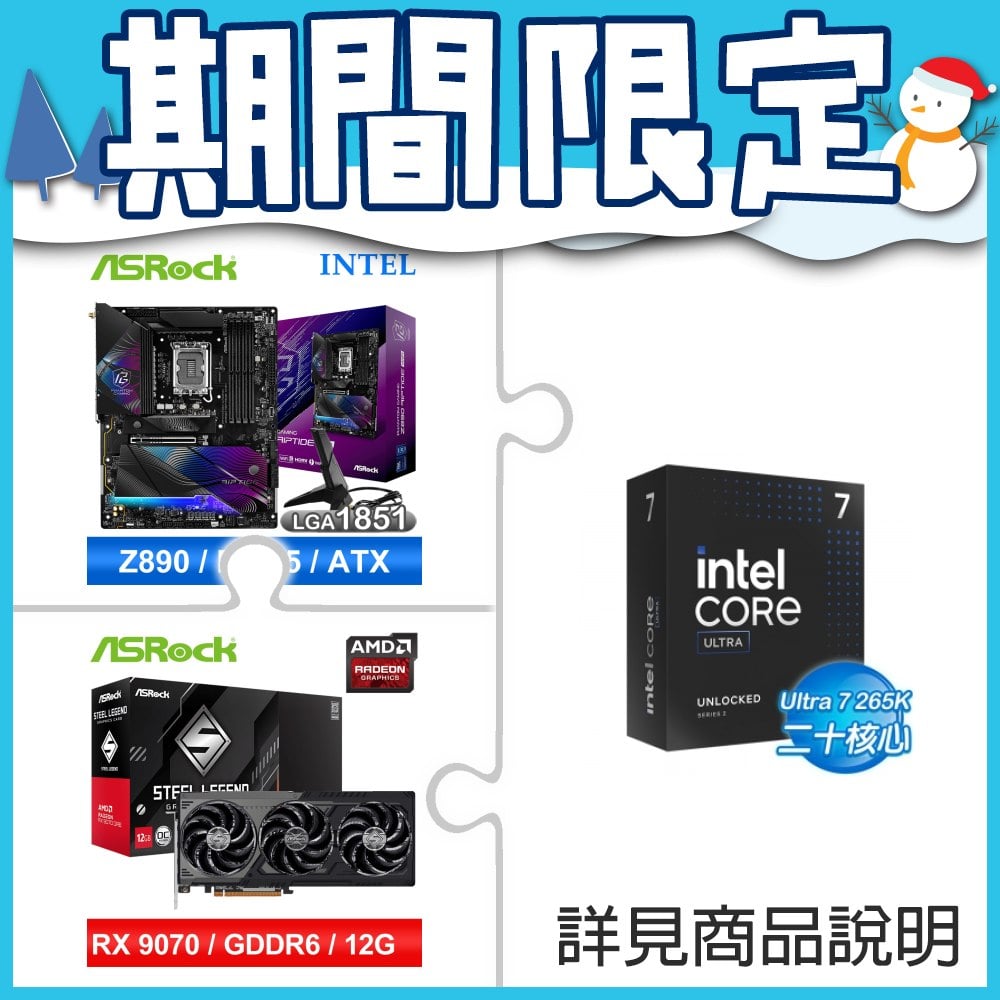 ☆期間限定★ Intel Core Ultra 7 265K+華擎 Z890 Riptide WiFi D5 ATX主機板+華擎 RX 9070 GRE Steel Legend Dark 12GB OC 顯示卡