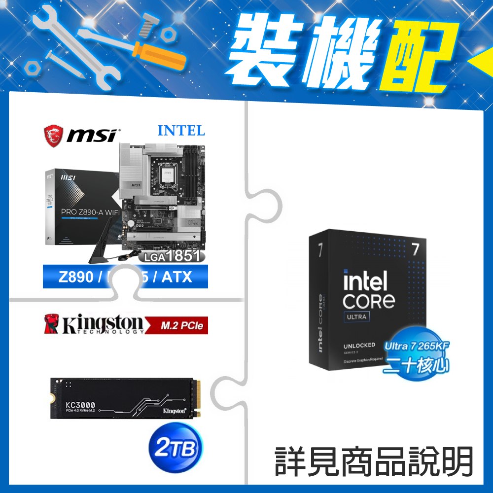 ☆裝機配★ Core U7 265KF+微星 PRO Z890-A WIFI D5 ATX主機板+金士頓 KC3000 2TB PCIe 4.0 NVMe M.2 SSD