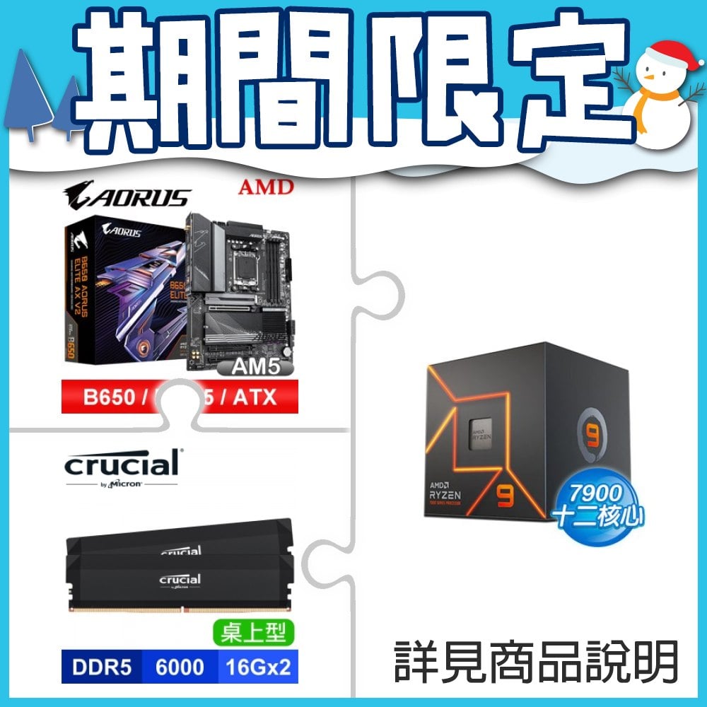 ☆期間限定★ AMD R9 7900+技嘉 B650 AORUS ELITE AX V2 D5 ATX主機板+美光 Crucial PRO DDR5-6000 32G (16G*2)黑 記憶體