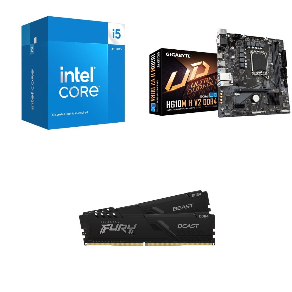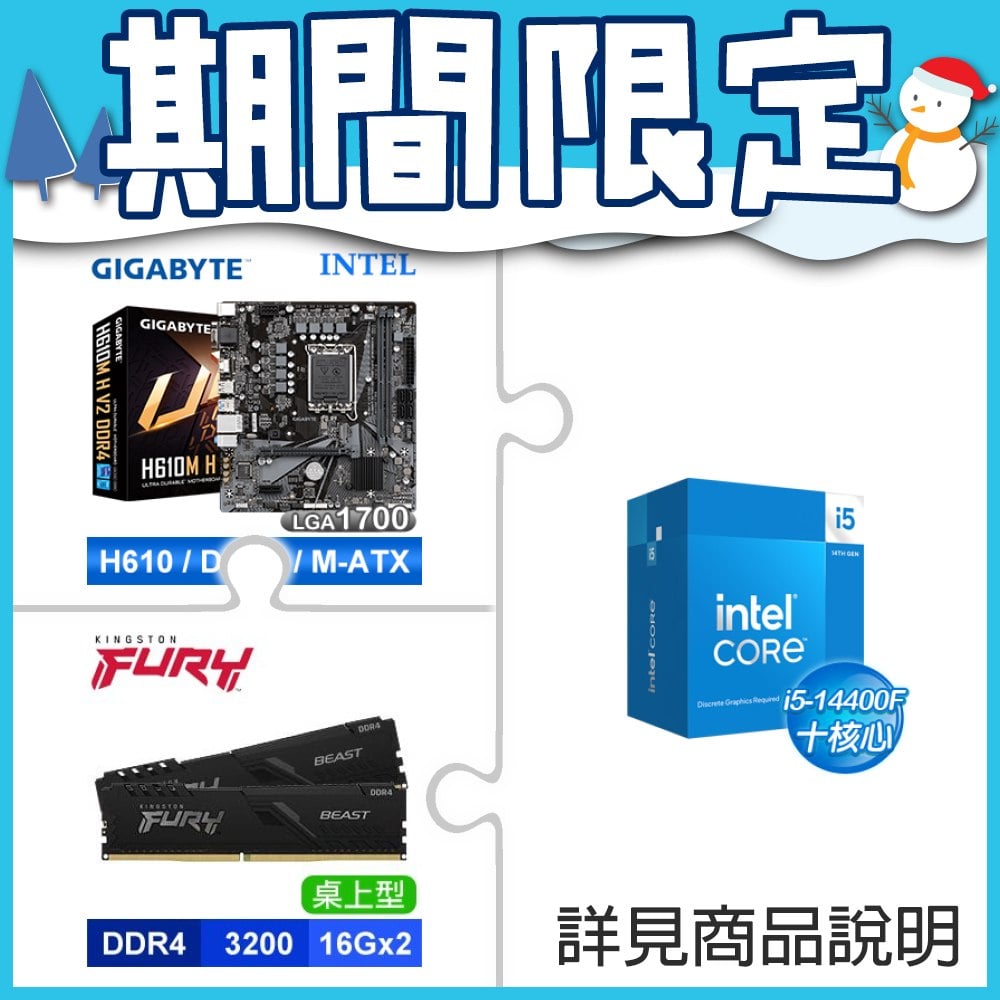 ☆期間限定★ i5-14400F+技嘉 H610M H V2 D4 M-ATX主機板+金士頓 獸獵者 D4-3200 16G*2 CL16 黑 記憶體