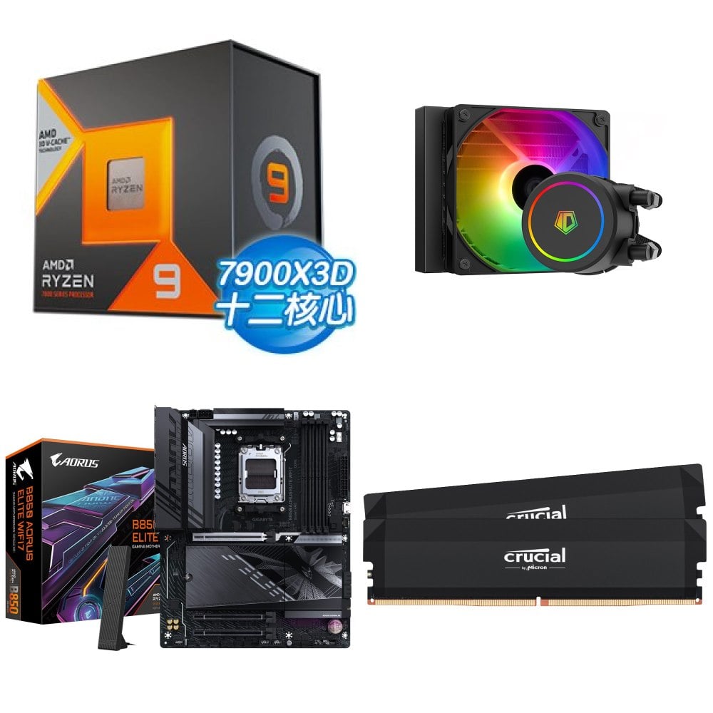 ☆期間限定★ AMD R9 7900X3D+ID-COOLING FROSTFLOW X 120 ARGB 水冷+技嘉 B850 AORUS ELITE WIFI7 ATX主機板+美光 Crucial PRO DDR5-6000 32G (16G*2)黑 記憶體