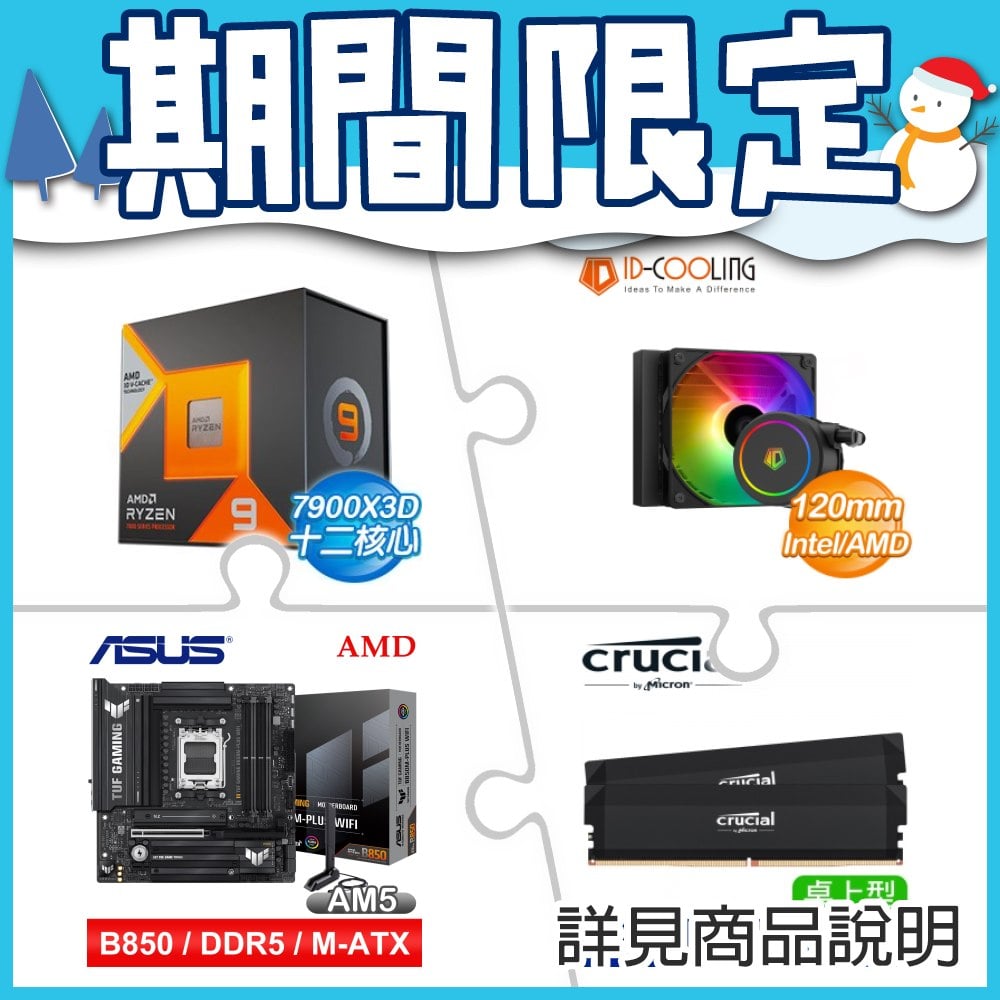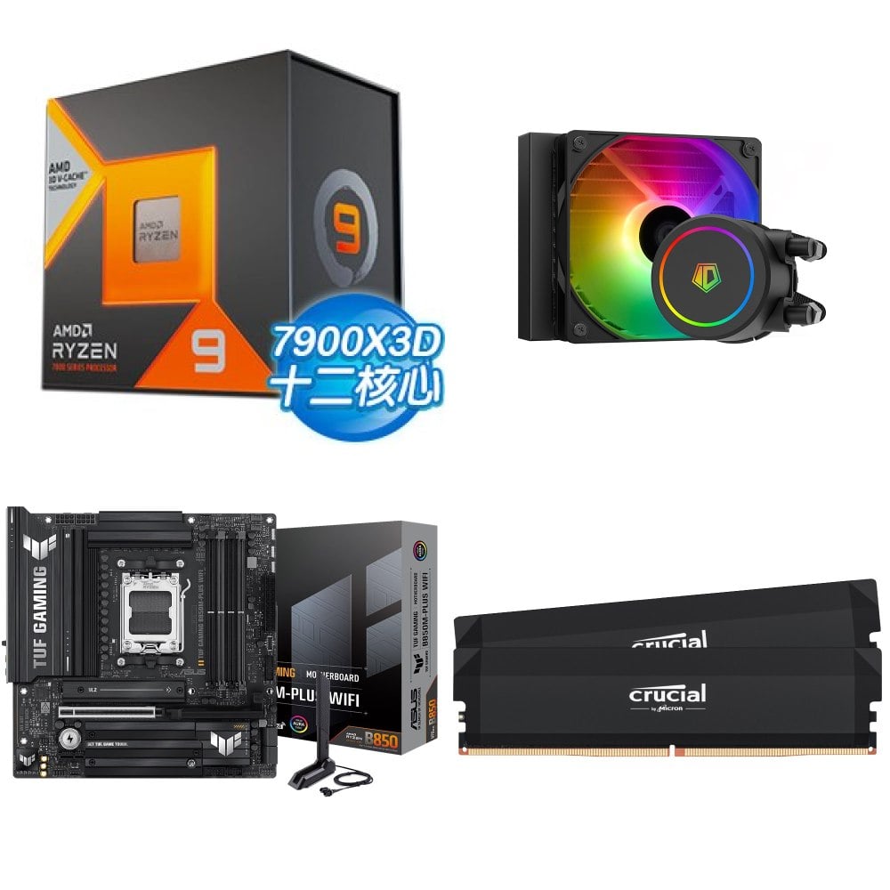 ☆期間限定★ AMD R9 7900X3D+ID-COOLING FROSTFLOW X 120 ARGB 水冷+華碩 TUF GAMING B850M-PLUS WIFI M-ATX主機板+美光 Crucial PRO DDR5-6000 32G (16G*2)黑 記憶體