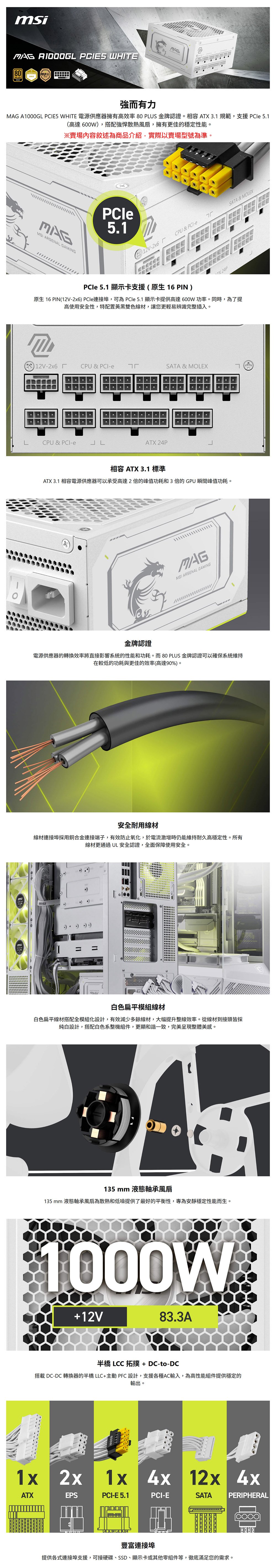 MSI 微星 MAG A1000GL PCIE5 WHITE 金牌 全模組 ATX3.1 PCIe 5.1 電源供應器(7年保)