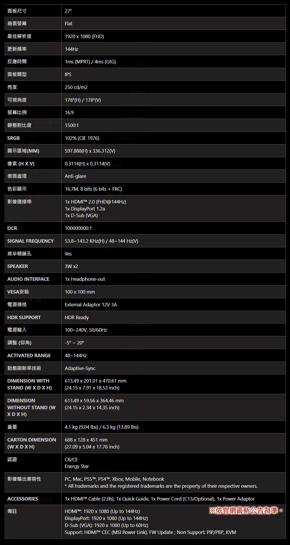 • 流暢的 144Hz 高更新率和 AMD FreeSync™ 帶來高品質娛樂體驗