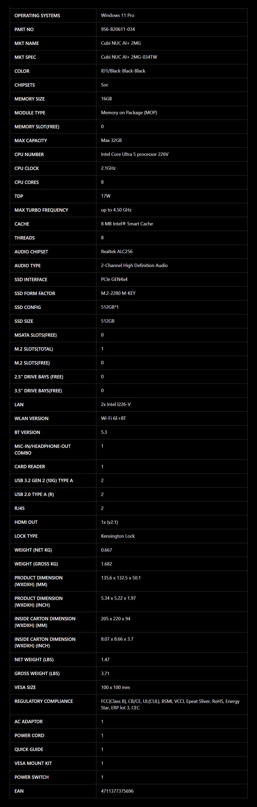 MSI 微星 Cubi NUC AI+ 2MG-033TW-B7258V32GS1TX11PNGPA 迷你電腦