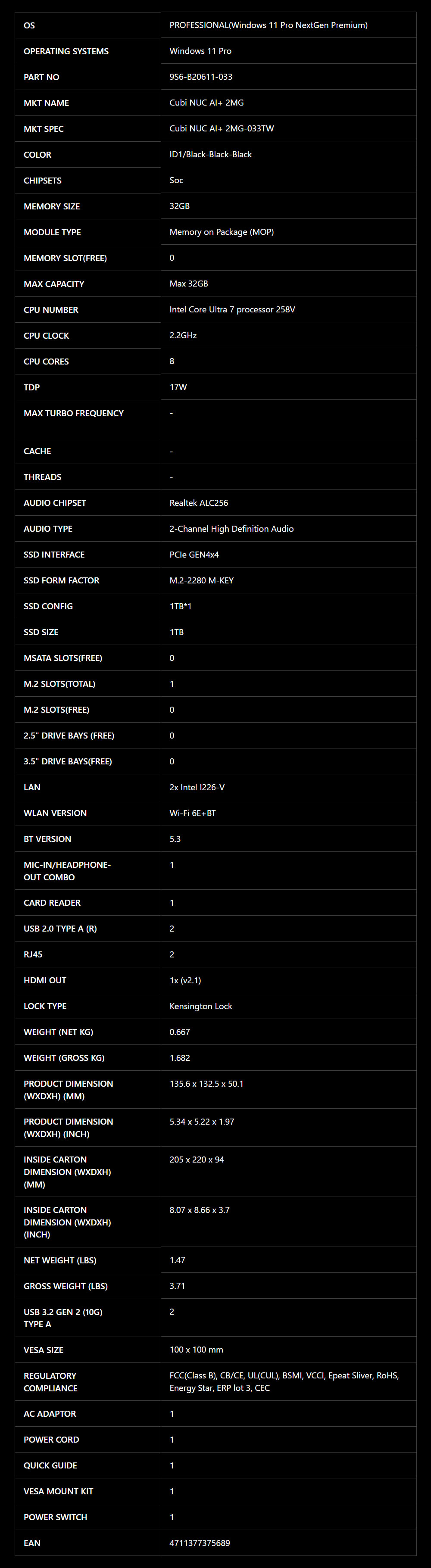 MSI 微星 Cubi NUC AI+ 2MG-033TW-B7258V32GS1TX11PNGPA 迷你電腦