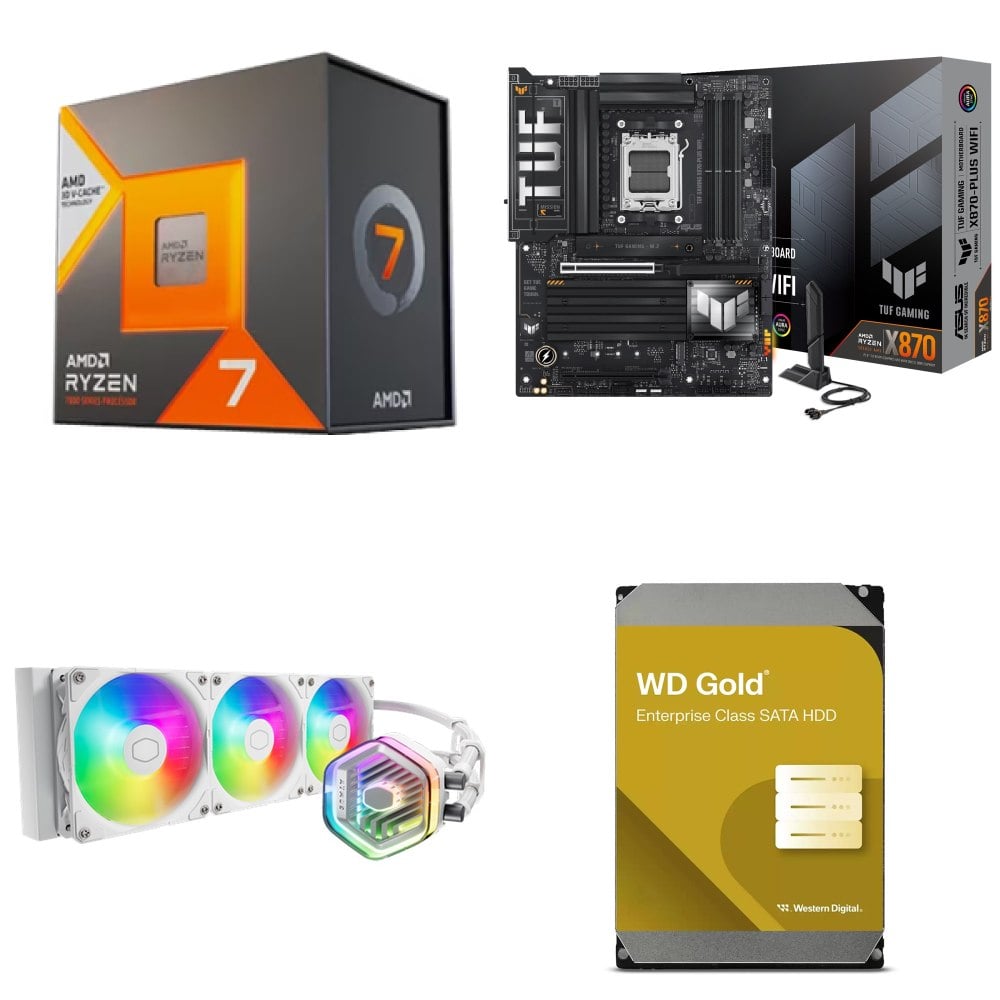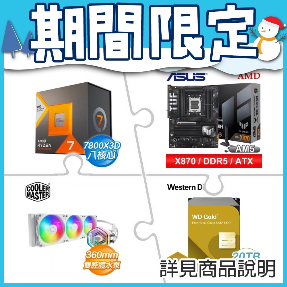 ☆期間限定★ AMD R7 7800X3D+華碩 TUF GAMING X870-PLUS WIFI ATX主機板+酷碼 MasterLiquid 360 Atmos ARGB 白色 水冷散熱器+WD 金標 20TB WD203KRYZ-5Y 企業級硬碟