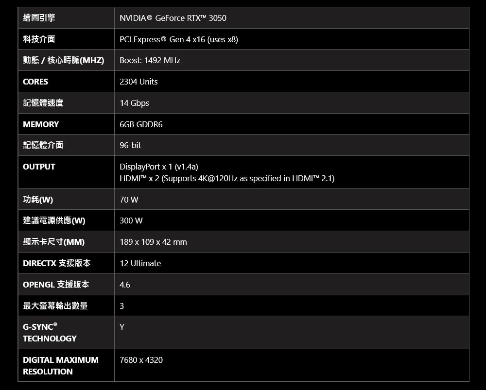 - GeForce RTX™ 3050 6GB 採用 NVIDIA Ampere 架構構建,具有專用光線追蹤核心、AI Tensor 核心和高速 G6 記憶體。升級至 GeForce RTX