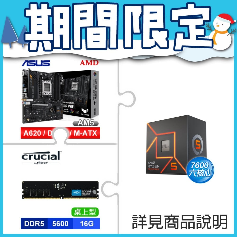☆期間限定★ AMD R5 7600+華碩 TUF GAMING A620M-PLUS WIFI M-ATX主機板+美光 Crucial DDR5-5600 16G 記憶體
