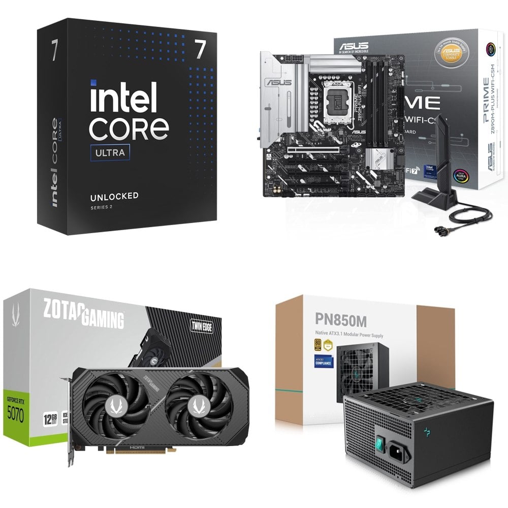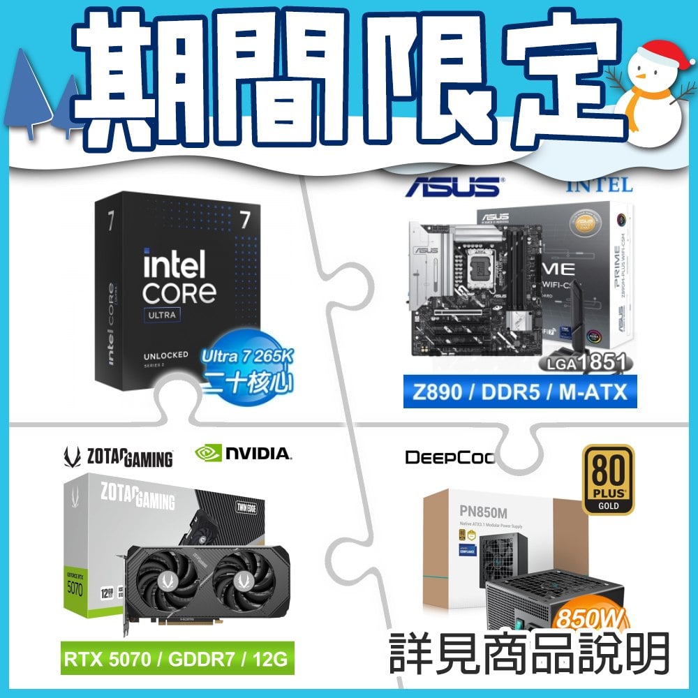 ☆期間限定★ Intel Core Ultra 7 265K+華碩 PRIME Z890M-PLUS WIFI-CSM D5主機板+索泰 RTX 5070 Twin Edge 12G 顯示卡+九州風神 PN850M 850W 金牌 全模 ATX3.1 PCIe 5.1 電源供應器