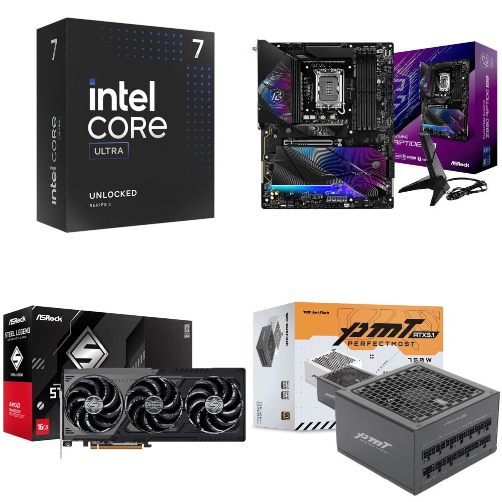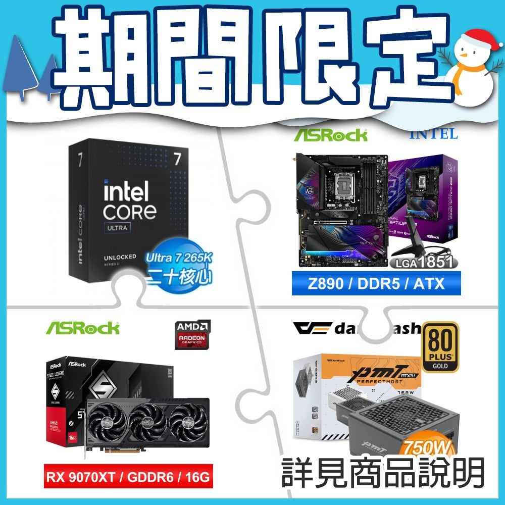 ☆期間限定★ Intel Core Ultra 7 265K+華擎 Z890 Riptide WiFi D5 ATX主機板+華擎 RX 9070 XT Steel Legend 16GB(DARK) 顯示卡+darkFlash PMT 750W 黑色 金牌 全模 ATX3.1 電源供應器